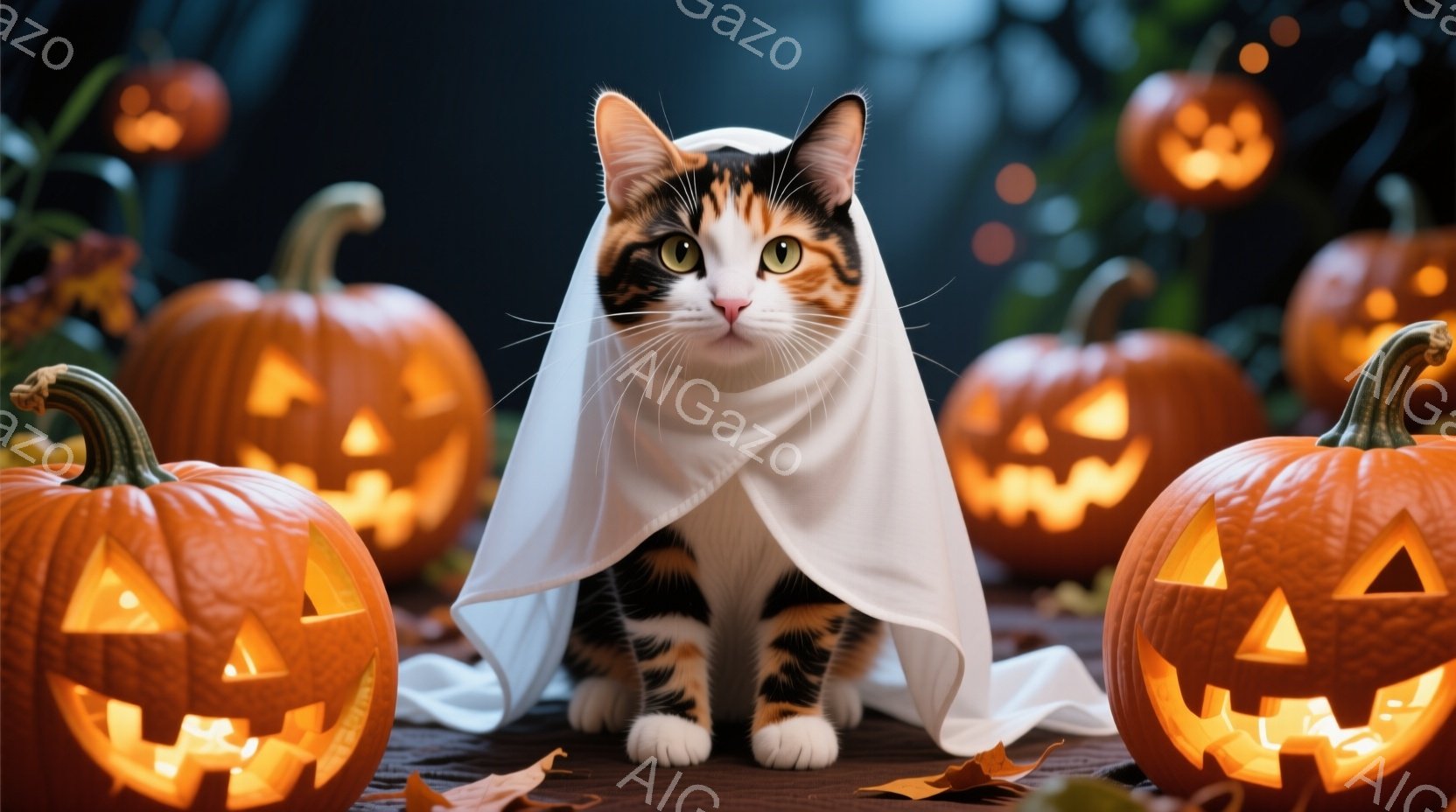 白い布を羽織った三毛猫が、正面を向いて立っています。背景には、ジャック・オー・ランタンがいくつか並べられており、ハロウィーンの雰囲気です。暖色系の照明と暗い背景が、ミステリアスで楽しいムードを醸し出しています。