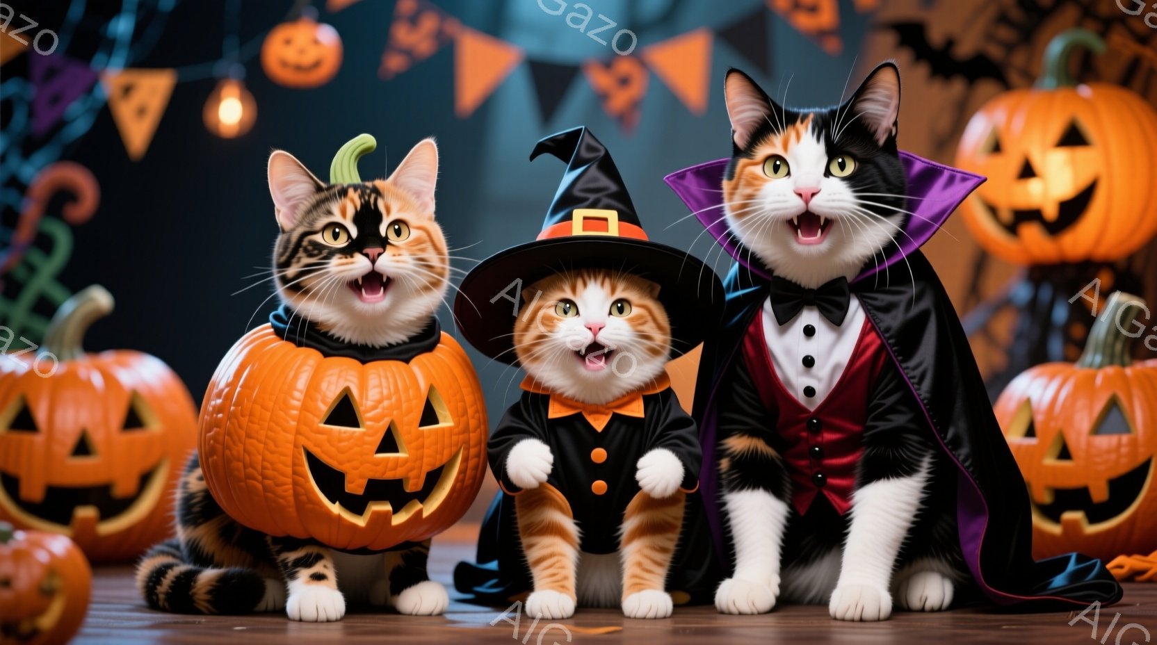 この無料AI生成画像「白と黒のまだら模様の猫が、散らばった紅葉の上を歩いており、鋭い眼差しで何かを見つめている。背景には、ハロウィン用に彫られたジャック・オー・ランタンが輝き、レンガ造りの道と木々の間を照らす提灯が秋の夜の温かい雰囲気を醸し出している。全体的に、秋のハロウィンの夜の静かで神秘的な雰囲気が漂う、魅力的な光景である。」は、2025年10月25日に作成されました。 サイズは 1664×928px の高解像度で、商用利用も可能なフリー素材として提供しています。