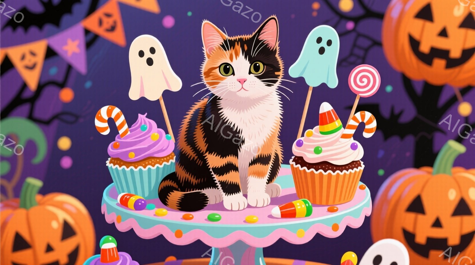 オレンジと黒の模様の猫が、カラフルなキャンディやカップケーキが飾られた大きなケーキの上に座っています。背景には、ハロウィーンの飾り付けであるカボチャやお化け、バットが描かれており、お祭り気分を盛り上げています。全体的に明るく、可愛らしい雰囲気で、ハロウィーンのお祝いを表現しています。