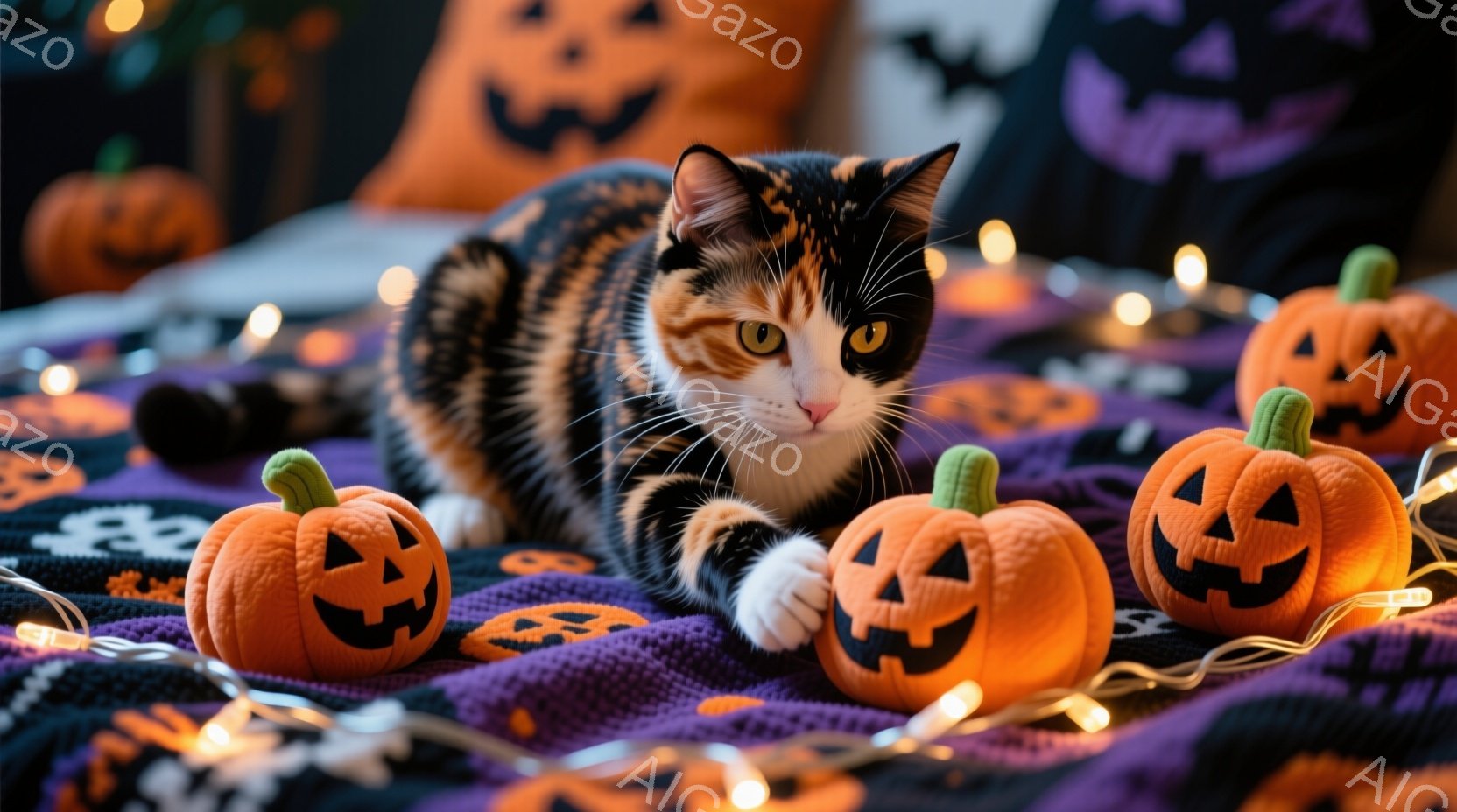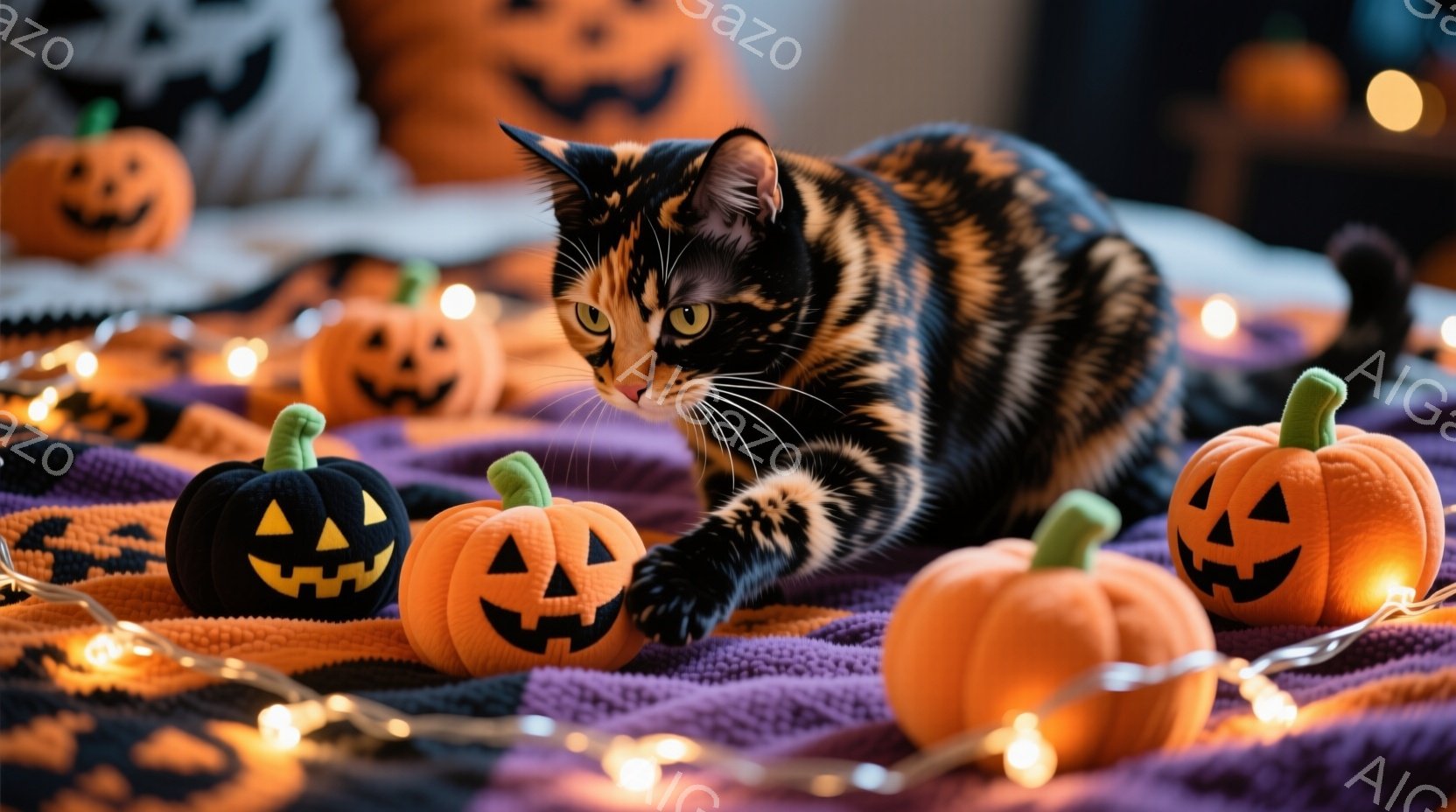 オレンジと黒の縞模様の猫が、ハロウィーンの小さなカボチャの置物の中にいます。猫は前足を伸ばし、カボチャに触れようとしており、その表情は遊び心に満ちています。背景には紫色の毛布と、温かい光を放つオレンジ色のイルミネーションライトがあり、ハロウィーンの楽しい雰囲気を演出しています。