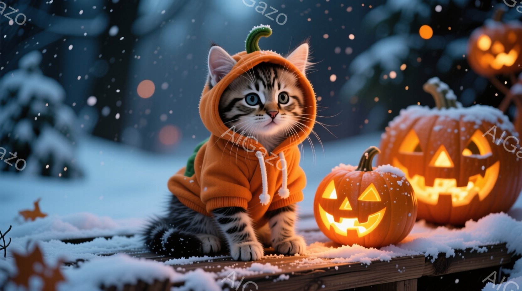 白と茶色の縞模様の猫が、オレンジ色のパーカーを着て、木製のテーブルの上に座っています。猫は前足を揃えて座り、好奇心とわずかな警戒心を表した表情でカメラを見つめています。背景には雪が降り積もり、彫刻されたジャック・オー・ランタンが灯って、幻想的でクリスマスの雰囲気を醸し出しています。