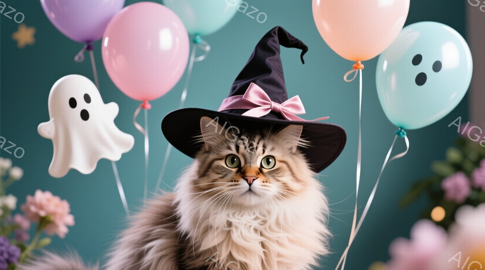 長毛のクリーム色の猫が、オレンジ色のリボンが付いた黒い魔女帽子をかぶって正面を見つめています。背景には、パステルカラーの風船と幽霊の飾りがあり、ハロウィーンの雰囲気を醸し出しています。猫は穏やかな表情で、柔らかい毛並みが際立っています。