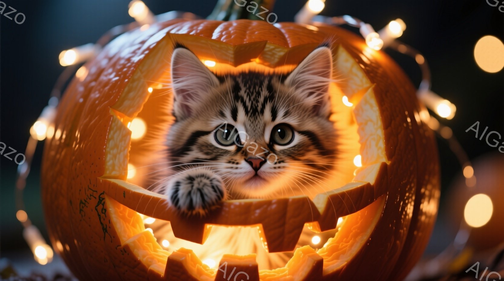 小さな縞模様の猫が、ジャック・オ・ランタンのようにくり抜かれたオレンジ色のカボチャの中に顔を出しています。猫は前を見据え、少し好奇心と遊び心のある表情を浮かべています。背景にはぼんやりとした自然の風景と、暖かく輝くストリングライトが散りばめられており、ハロウィーンの雰囲気と温かい光が感じられます。