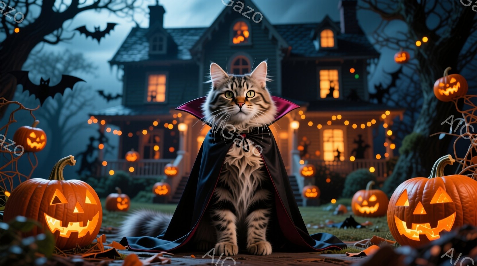 縞模様の猫が、襟付きの黒いケープを身につけて正面を向いて座っています。背景には、ハロウィーンのランタンで飾られた、不気味な雰囲気の大きな屋敷があり、黒いシルエットのコウモリが舞い、地面には落ち葉が散らばっています。全体的に、ハロウィーンの夜の神秘的で少し怖い雰囲気を醸し出しています。