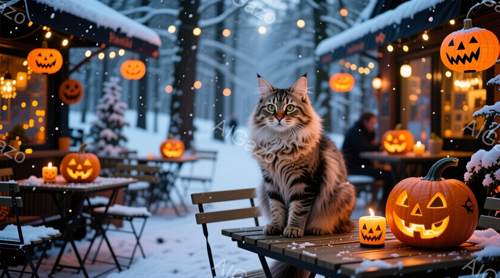 白い毛並みの大きな猫が、ハロウィーンの飾り付けがされたカフェのテーブルに座っています。背景にはオレンジ色に光る様々な大きさのジャック・オ・ランタンが並び、雪が舞う冬の夜の幻想的な雰囲気を醸し出しています。カフェの建物は暗く、温かい光が差し込み、雪景色の中に温かく優しい印象を与えます。