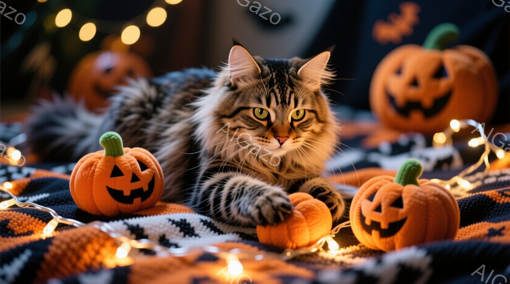 縞模様の猫が紫色の毛布の上に横たわり、ハロウィーンの小さなジャック・オ・ランタンに囲まれています。猫は前足を伸ばしてリラックスした姿勢で、明るいオレンジ色のカボチャを見つめています。背景にはぼんやりと装飾が映り、暖かく幻想的な雰囲気が漂っています。