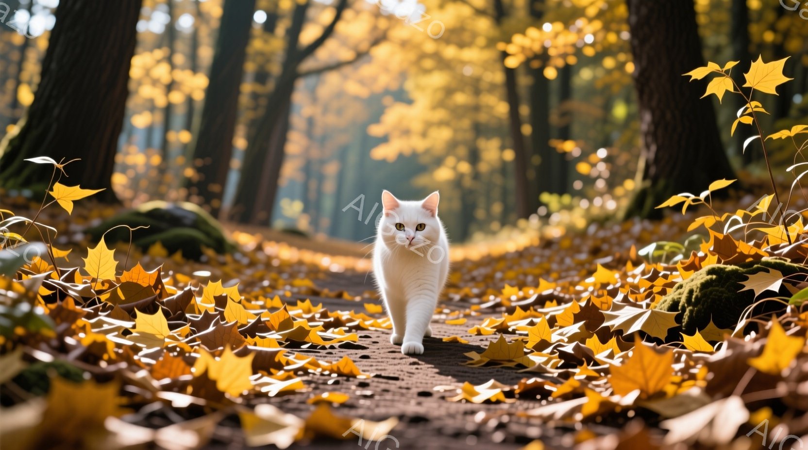 白い猫が落ち葉が敷き詰められた森の道をまっすぐ歩いている。背景には木々が生い茂り、秋らしい暖色系の光が差し込んでいる。猫は前方をまっすぐ見つめ、静かで落ち着いた雰囲気を醸し出している。