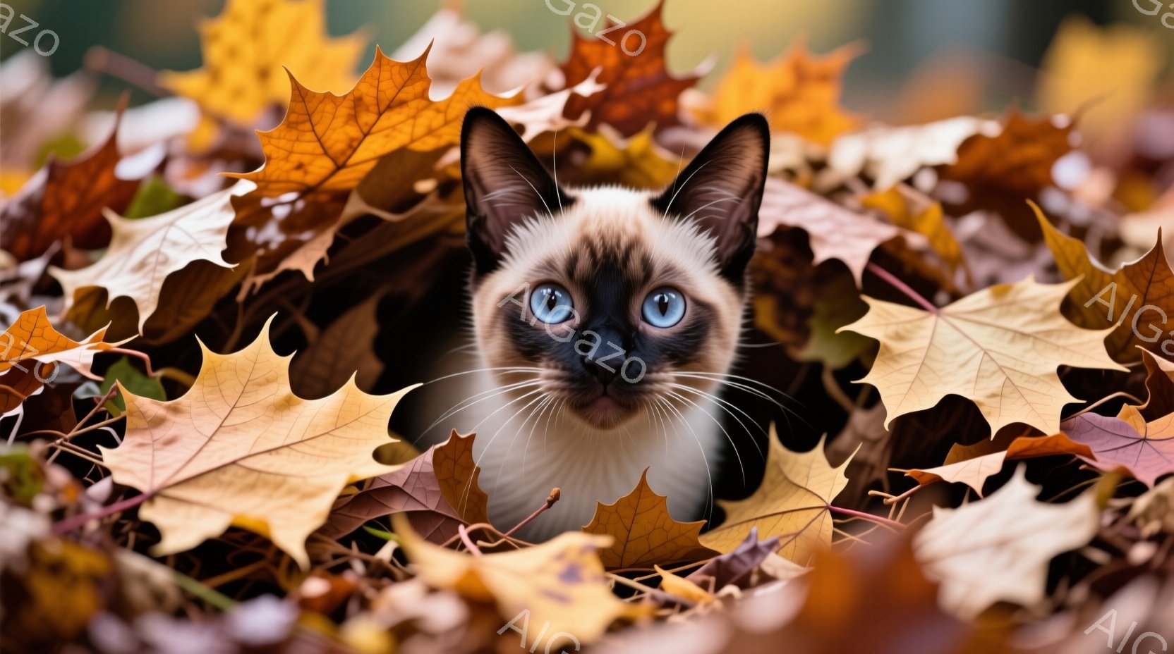 シーマ模様の猫が、落ち葉の中に顔を覗かせている。澄んだ青い瞳が印象的で、好奇心と少しの警戒心をたたえた表情をしている。背景は秋らしい茶色や黄色の落ち葉で覆われ、暖かく穏やかな雰囲気を醸し出している。