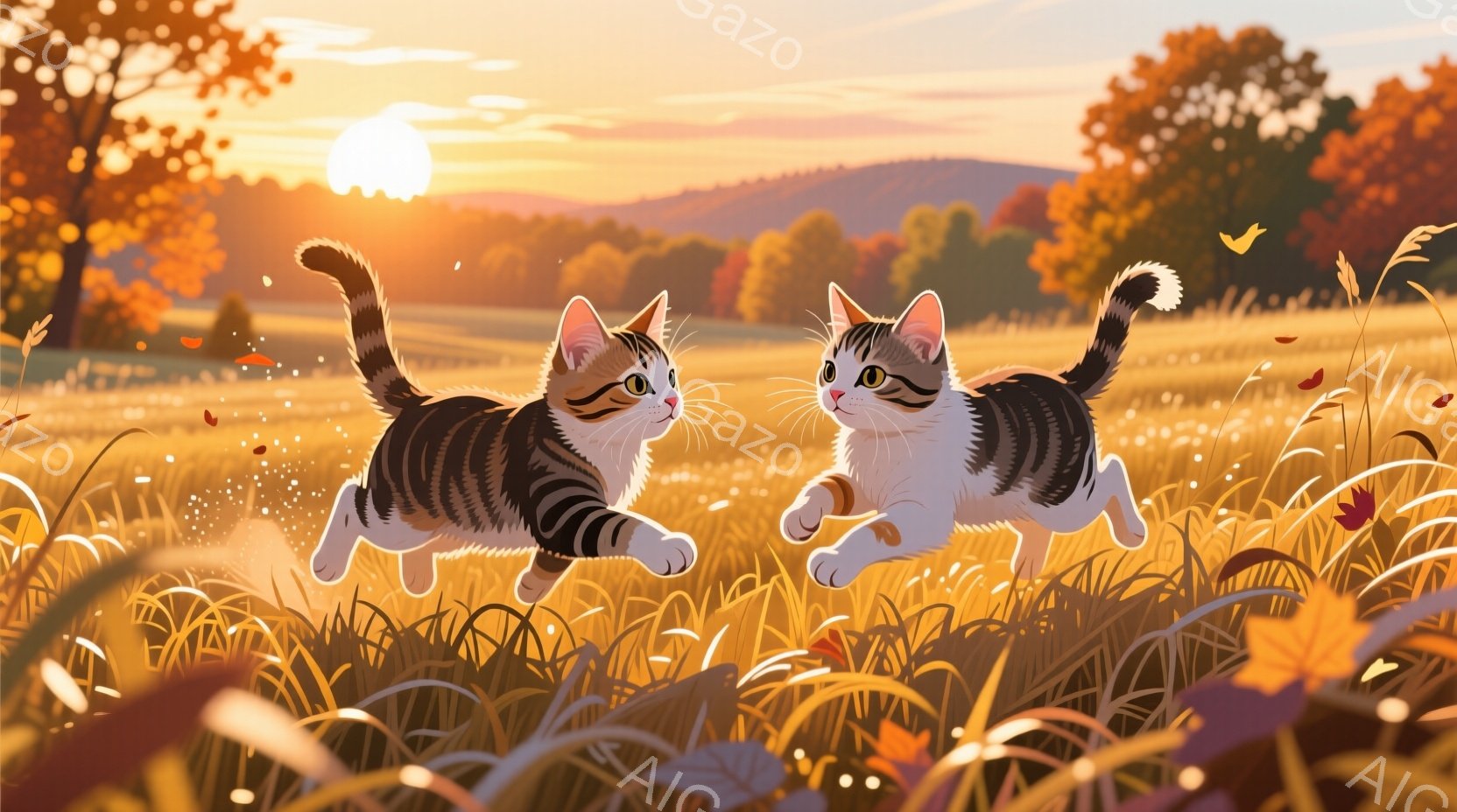 2匹の縞模様の猫が、黄金色の草むらの中を駆けている。太陽が沈む夕暮れ時で、背景には緑豊かな木々が広がり、温かく穏やかな雰囲気を醸し出している。猫たちは楽しそうに走り、その躍動感と夕焼けの暖かさが相まって、ノスタルジックで牧歌的な情景を作り出している。