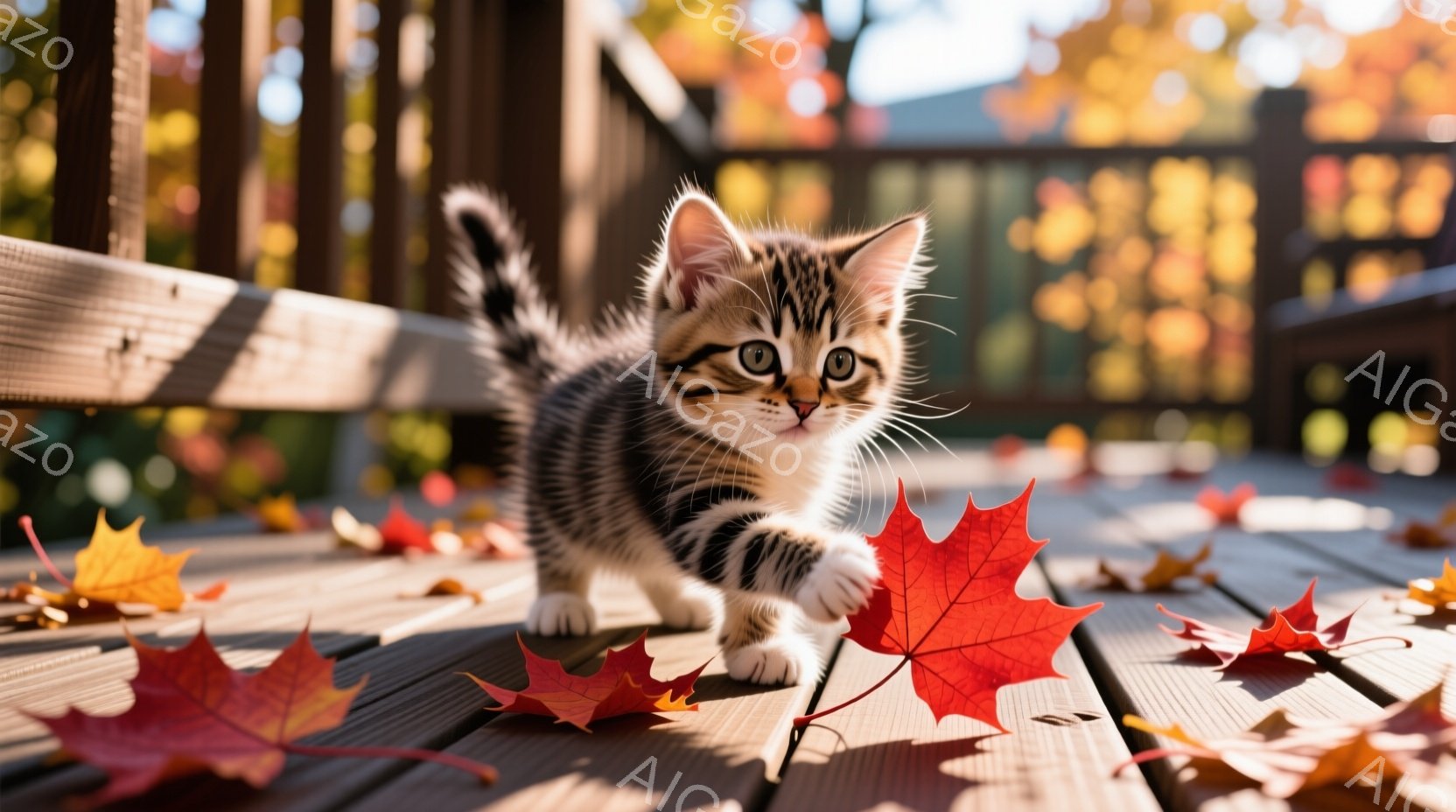 縞模様の小さな子猫が、落ち葉が散らばる木のデッキの上を歩いています。子猫は前足を伸ばし、好奇心に満ちた表情で何かを見つめています。背景には鮮やかな紅葉と木製の柵が見え、秋の穏やかで暖かい雰囲気が漂っています。