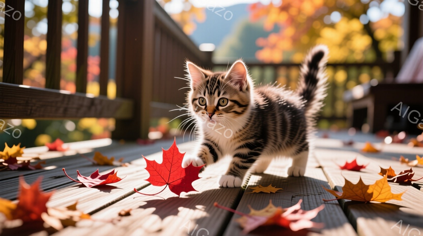 小さな縞模様の猫が木のデッキの上を歩いています。秋の赤いカエデの葉が猫の周りに散らばり、背景には緑豊かな植物とぼやけた家の外観が見えます。暖かく柔らかな光が差し込み、秋の穏やかな雰囲気を醸し出しています。