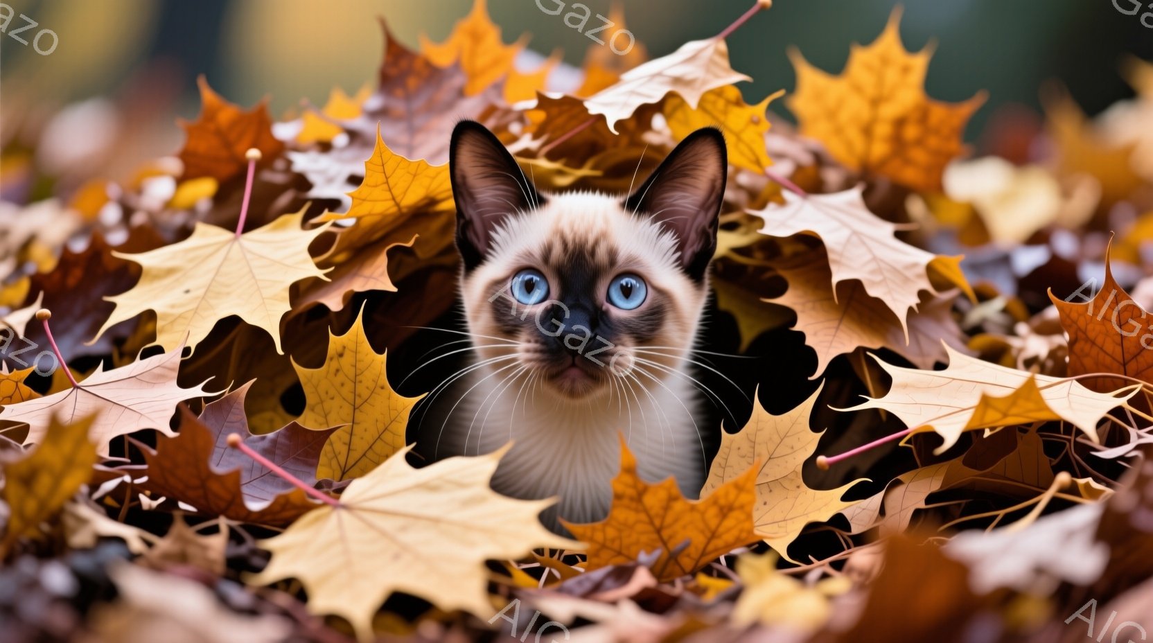 シーマ模様の猫が、落ち葉の中に隠れている様子が写っている。猫は青い目を持ち、好奇心旺盛な表情でこちらを見ている。背景は鮮やかなオレンジや黄色の落ち葉で埋め尽くされ、秋の穏やかで暖かい雰囲気を醸し出している。
