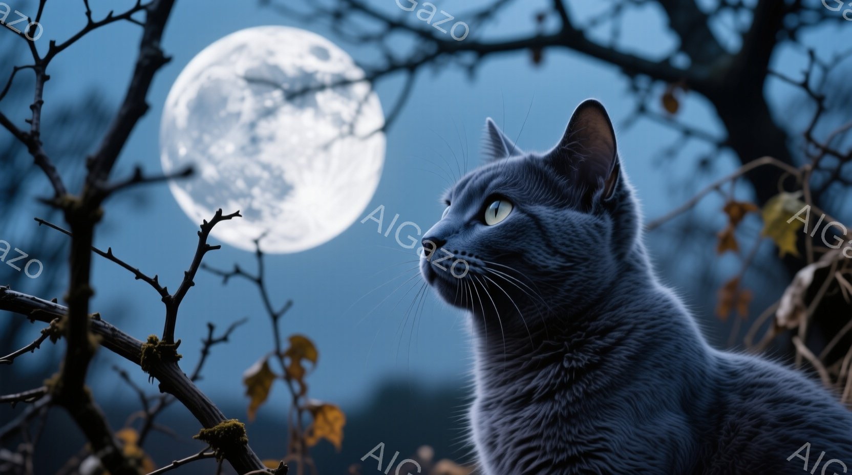 空を見上げる灰色の猫が写っています。猫は枝に寄りかかり、鋭い目つきで月を見つめています。背景には、暗い空と、枝の隙間から見えるぼんやりとした満月があり、静かで神秘的な雰囲気を醸し出しています。