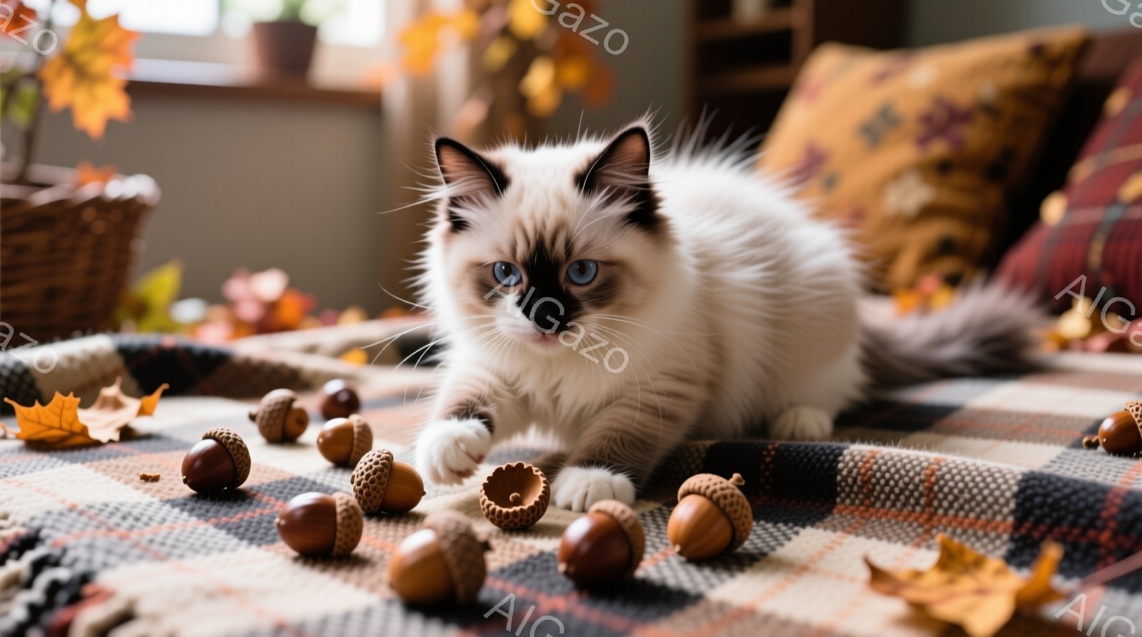 白と茶色の毛並みを持つ子猫が、チェック柄の毛布の上に散らばったドングリの間で前進している様子が写っている。子猫は青い目をしており、少し緊張した表情で前を見据えている。背景には家具が見え、暖色系の照明と落ち葉が秋の穏やかな雰囲気を醸し出している。