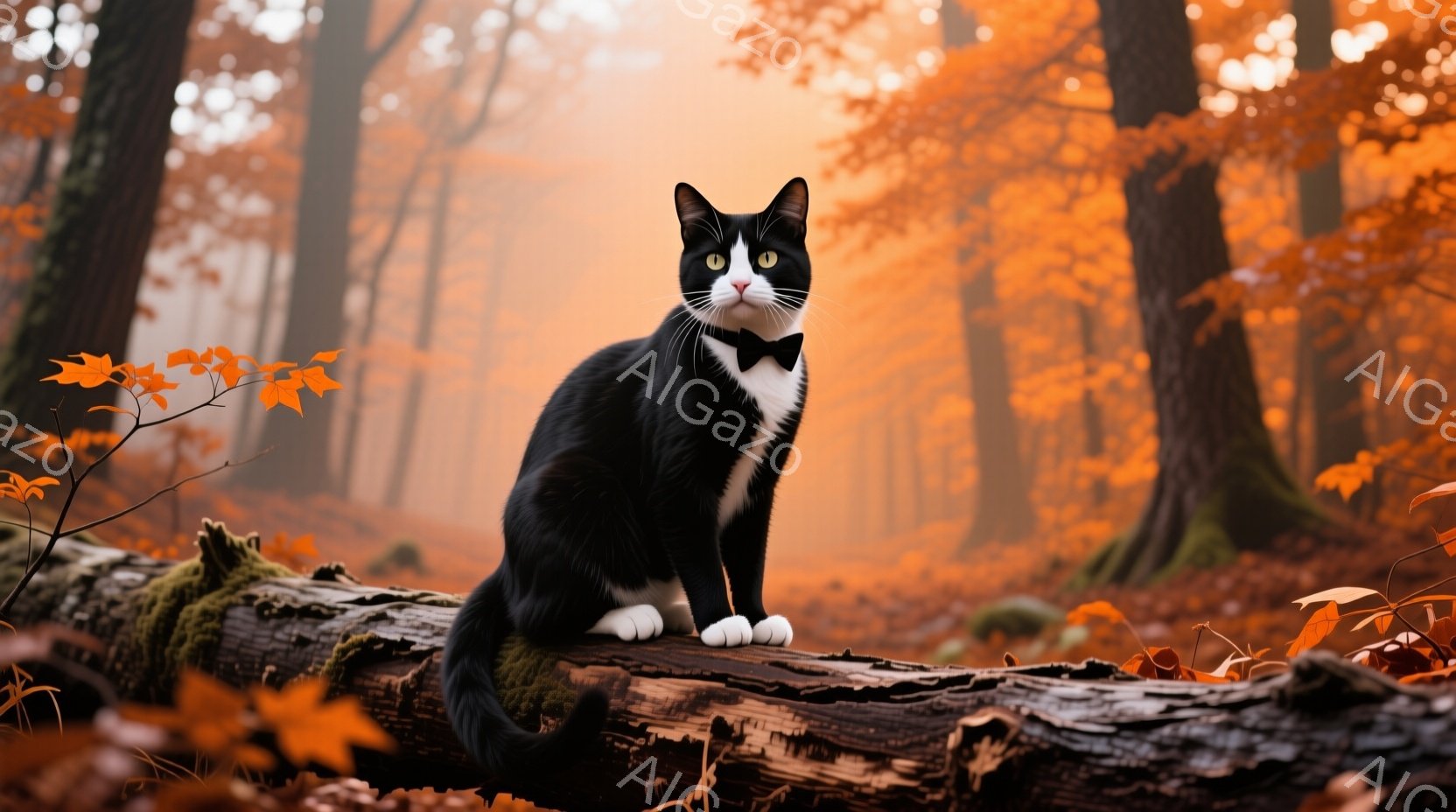 白と黒の猫が、朽ちた丸太の上で前足を揃えて座っている。鮮やかなオレンジ色の背景には、秋の森が広がり、落ち葉が散りばめられている。猫は首に蝶ネクタイをつけ、まっすぐ前を見つめる真剣な表情をしている。