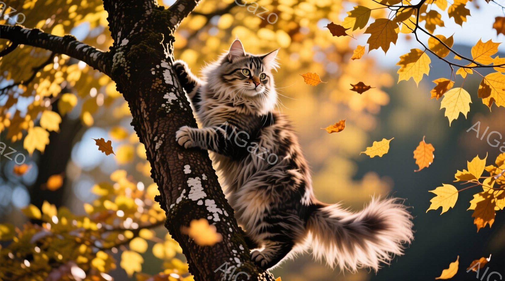 長毛の縞模様の猫が、苔むした木の幹によじ登っている様子が写っている。猫は上を見つめ、ふさふさとした尻尾が特徴的だ。背景には、秋らしい紅葉が舞い、暖かく穏やかな雰囲気を醸し出している。