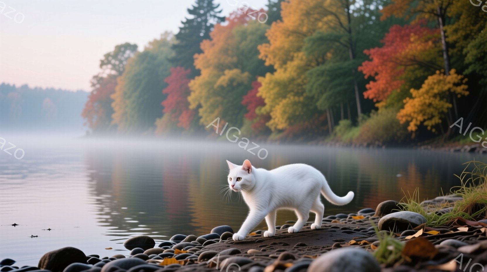 白い猫が小石の海岸を歩いている姿が描かれている。背景には霧のかかった湖と、紅葉で色づいた木々が広がり、穏やかで幻想的な雰囲気を醸し出している。猫は前方をまっすぐ見つめ、凛とした佇まいを見せている。