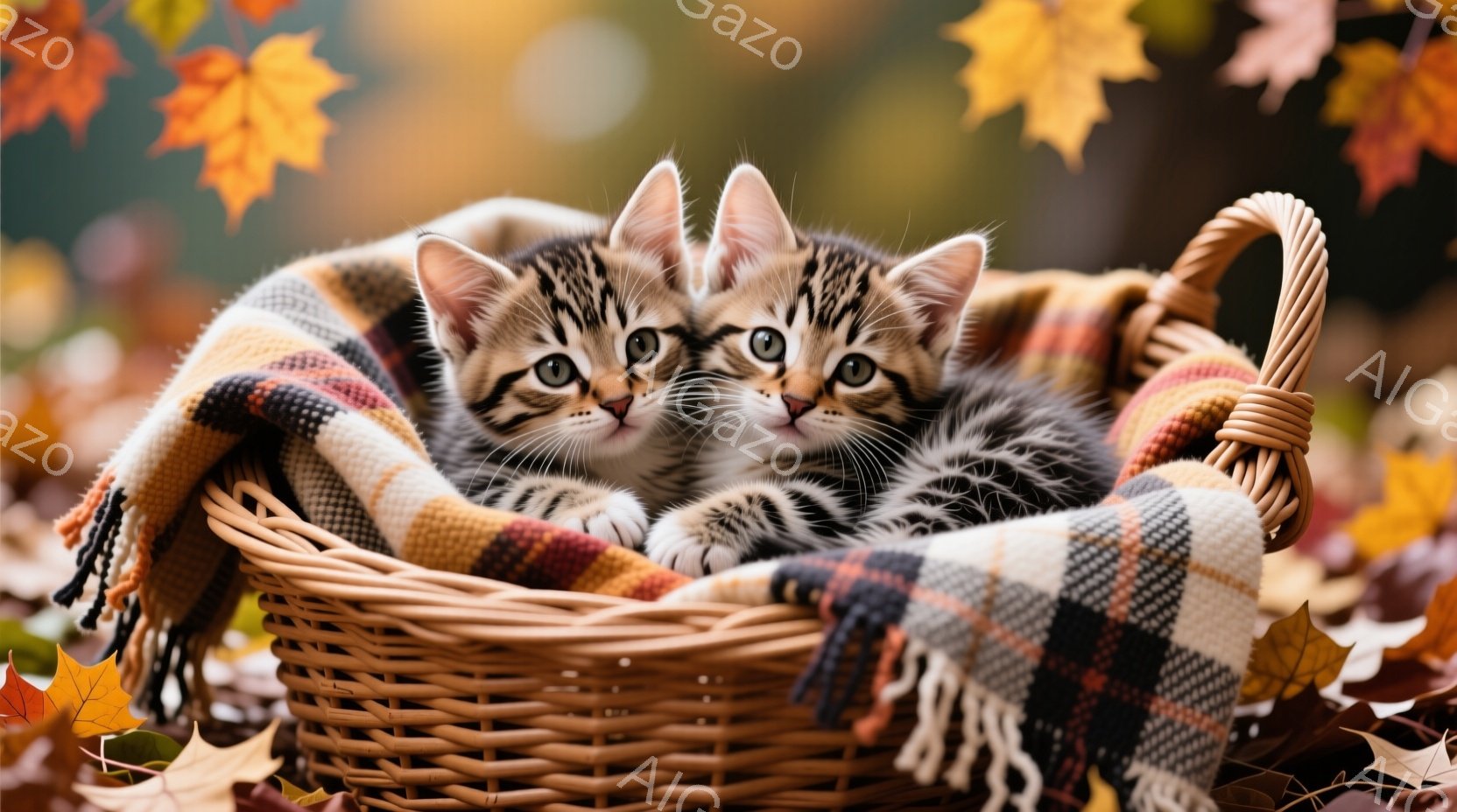 籠の中に二匹の縞模様の小さな子猫が寄り添って座っています。子猫たちは大きな緑色の目をしていて、カメラに向かって好奇心旺盛な表情を浮かべています。背景には落ち葉が散らばり、暖かく穏やかな秋の雰囲気を醸し出しています。