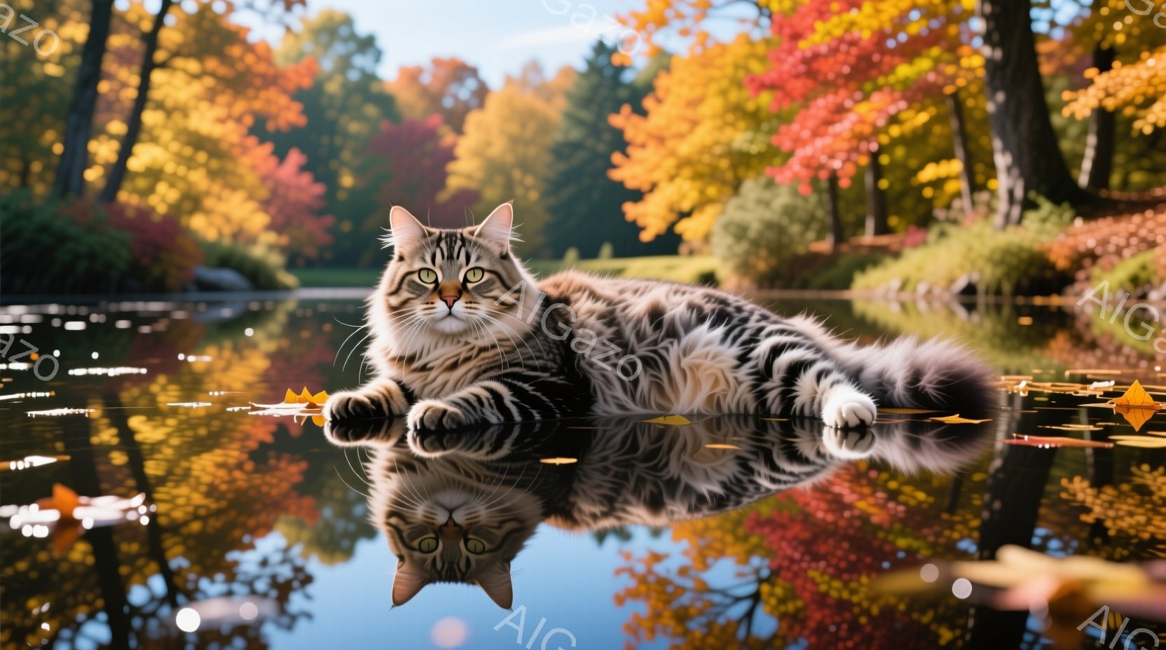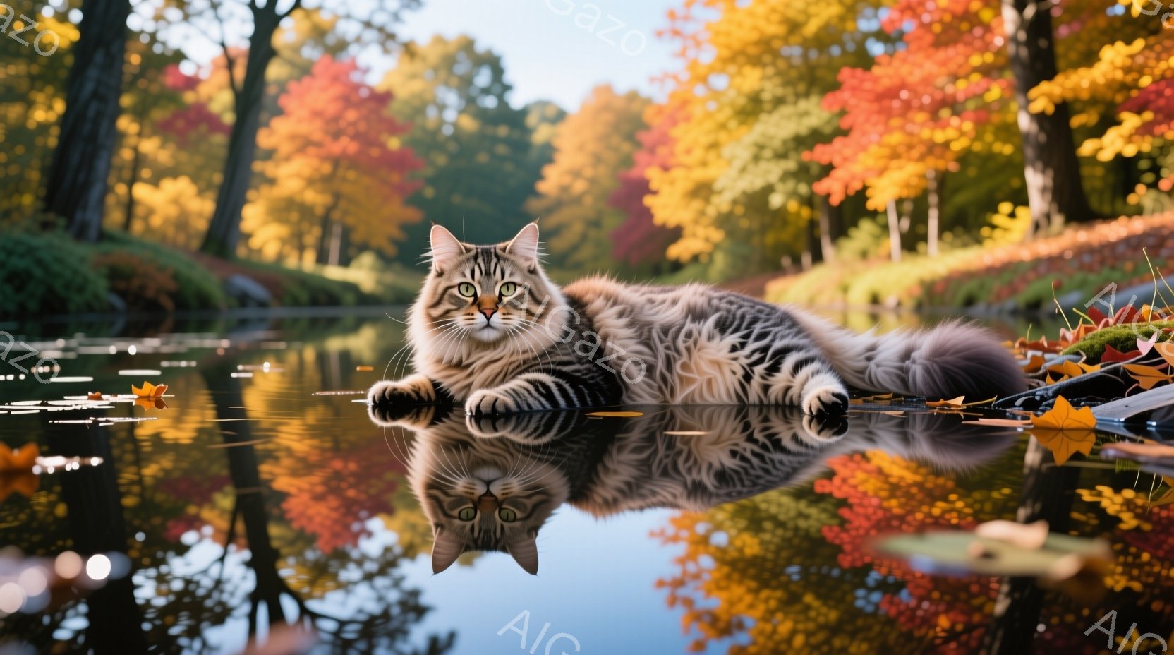 この、自然が美しい秋の景色が描かれており、その中で長毛の猫がリフレクションをつくって池の水面に座っています。猫は大きな白と黒の斑点がある、典型的な豊かな毛を持っており、姿勢や表情は一見怠けないその他の動物と似ています。背景には金色の樹木があり、落葉が池の周囲で大きく散らばっています。 雰囲気は平和で優しく、自然と共にリラックスするかのような感覚を与えます。