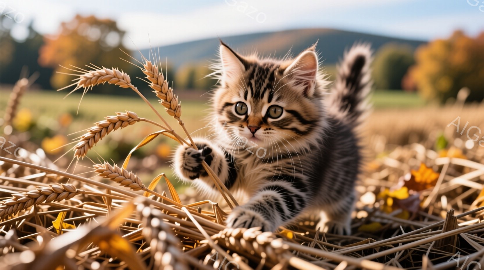 縞模様の小さな子猫が、黄金色の麦畑の中で遊んでいます。猫は前足を伸ばして何かを捕まえようとしており、好奇心と遊び心にあふれた表情をしています。背景には緑の丘と木々が見え、晴れた秋の日の穏やかな雰囲気が漂っています。