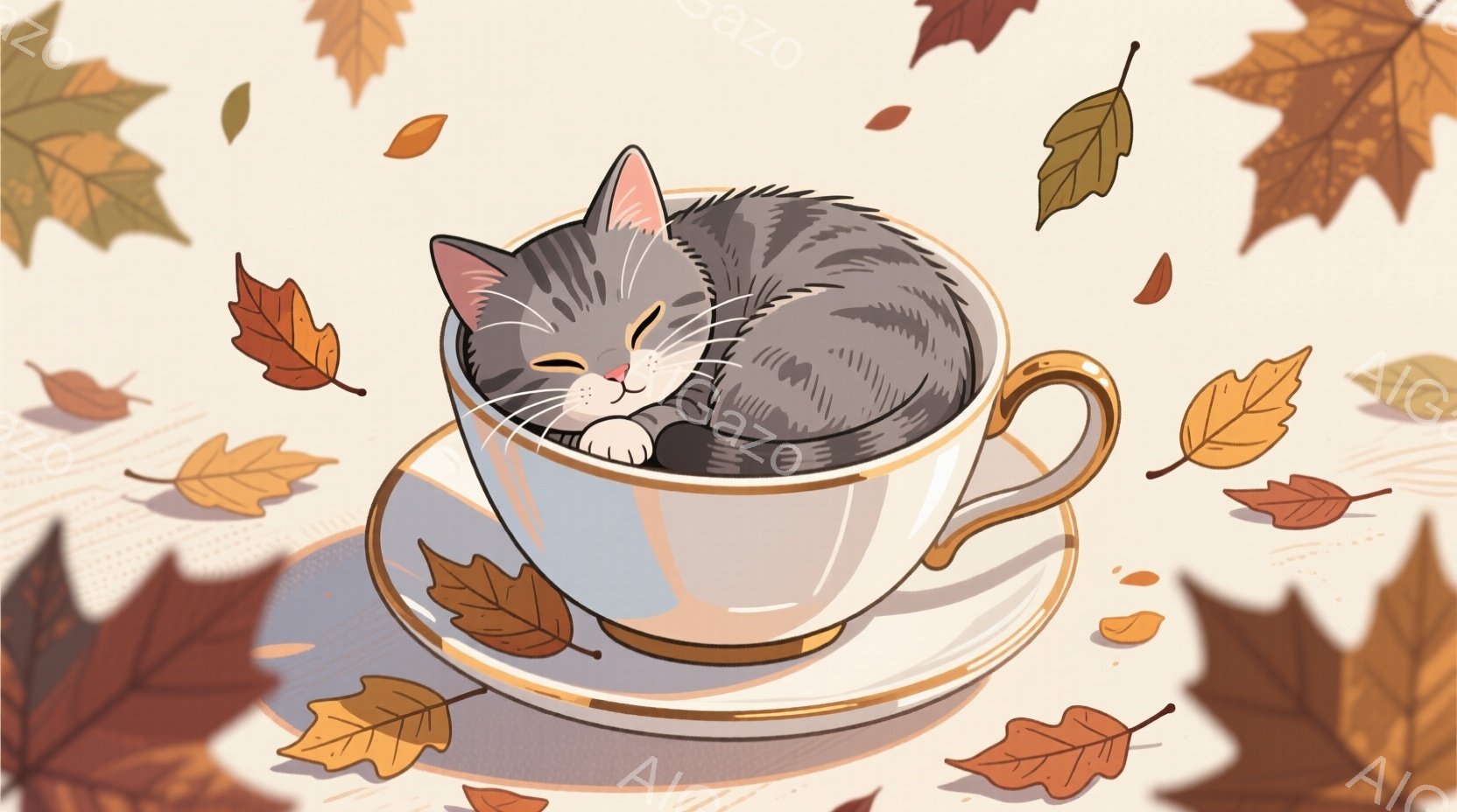 温かいカップの中に、丸まって眠る灰色の猫が描かれています。カップは繊細な金色の縁取りが施され、背景には散りゆく紅葉が舞っています。全体的に穏やかで、秋の暖かさを感じる、可愛らしい雰囲気です。
