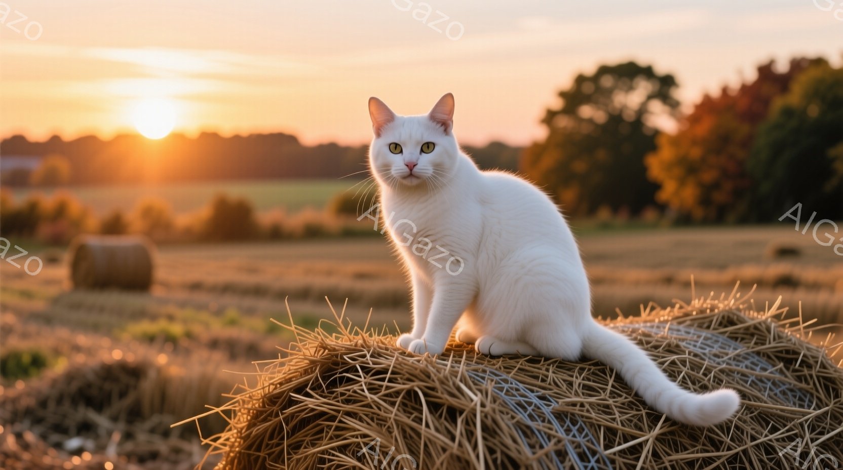 白い猫が丸まった干し草の俵の上に座り、遠くを見つめています。夕暮れ時の暖かな光が猫と周囲の草原を照らし、秋の風景が広がっています。背景にはぼんやりと木々が見え、穏やかで牧歌的な雰囲気が漂っています。
