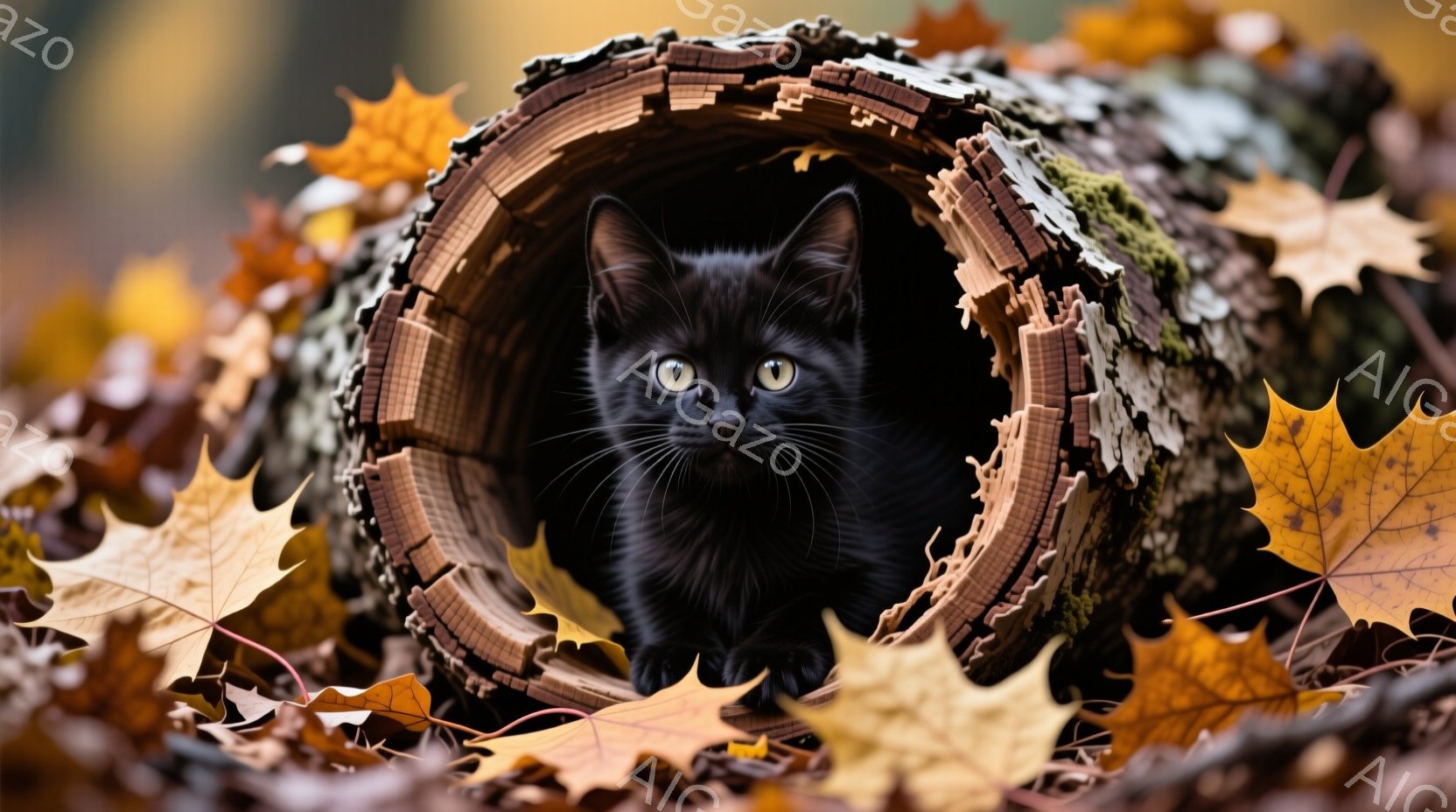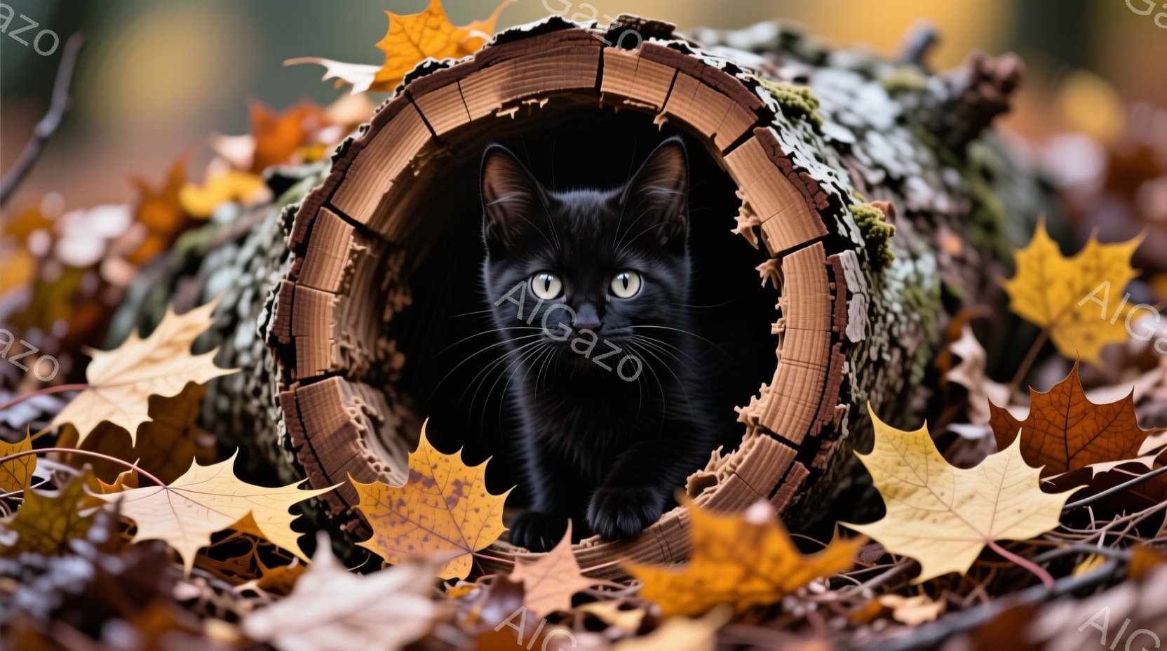 黒い子猫が、木の切り株のような筒の中に身を隠し、こちらをじっと見つめている。周囲には散った紅葉が敷き詰められており、秋の静かで穏やかな雰囲気を醸し出している。子猫の緑色の瞳が、その可愛らしさをさらに引き立てている。