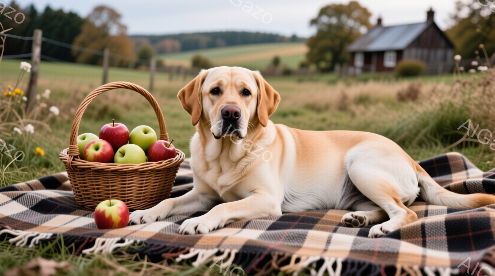 明るい茶色の毛並みを持つラブラドール・レトリバーが、チェック柄のブランケットの上にゆったりと横たわっています。その隣には、赤いリンゴと緑のリンゴがたくさん入った編み込みのバスケットが置かれています。背景には、緑の丘陵地帯に点在する家々が見え、穏やかで牧歌的な雰囲気が漂っています。