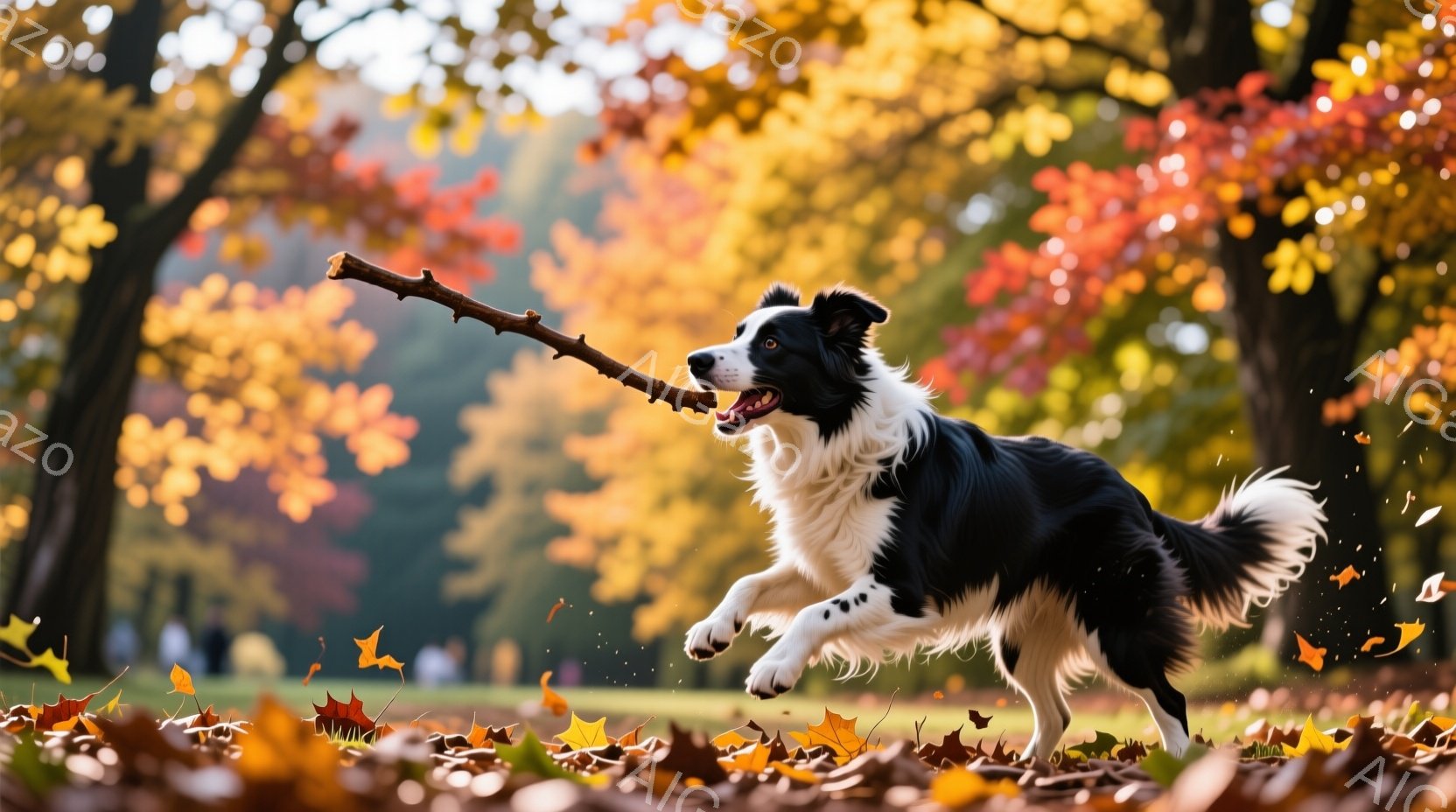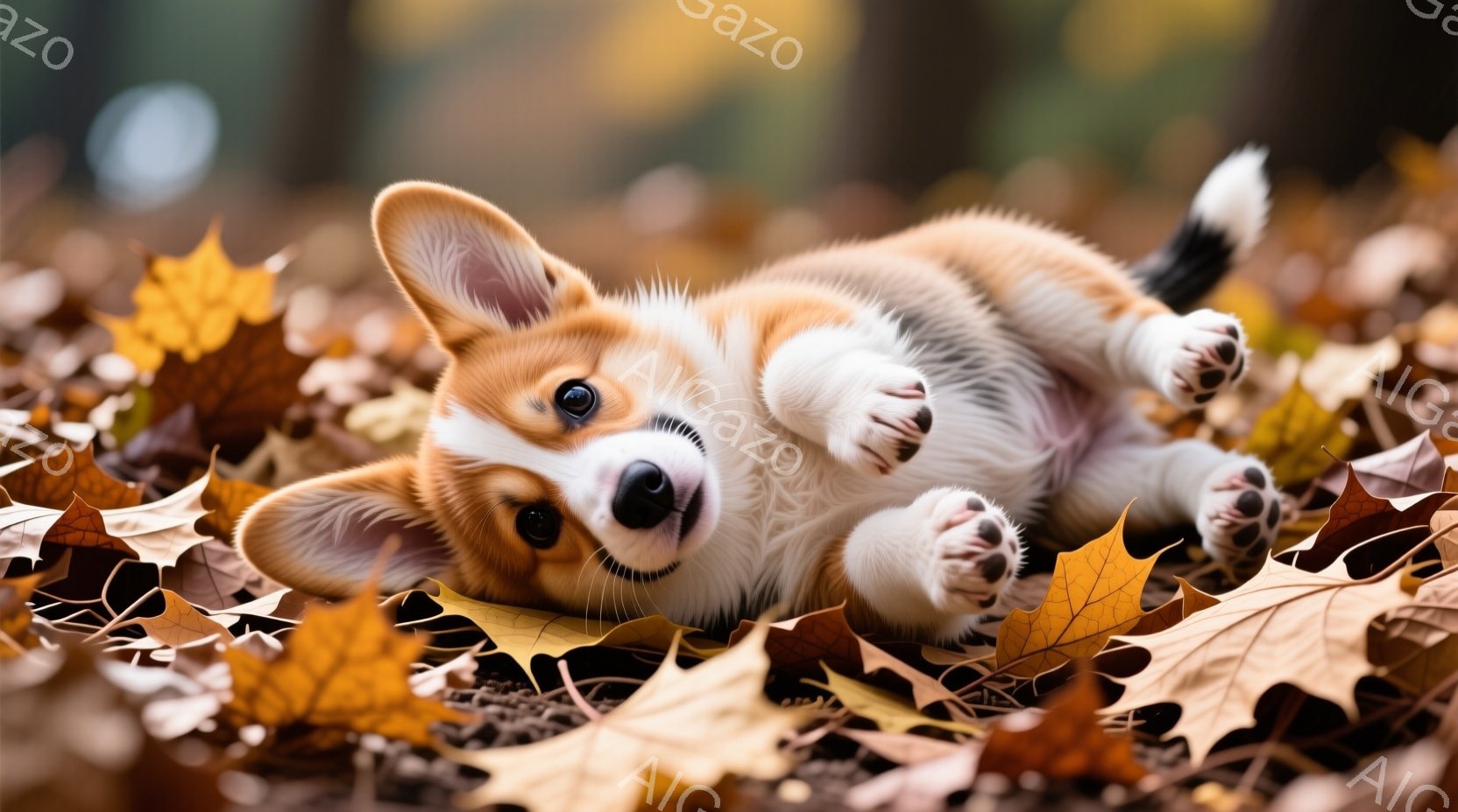 動物の写真です。その中には、小型の狗のような犬が描かれています。犬は赤と白のチェスターフィッシュカラーの毛を持ち、縁の方向で足を巻き伸ばして、単に楽しんでいるように見えます。犬は黄色の葉の上に横たわっており、その周りは多くの同じ色の葉が散らばっていることから、秋のシーンであることが明示されます。 犬の表情は落ち着いており、目はオープンで、鼻は上に突き出しています。その髭も見えるようですが、特定の人物の服装、髪型、表情、動作や姿勢を推測することはできません。背景は単色の黄色の葉になっており、自然的な環境が透明かつ鮮やかであり、犬の表情により温かみがある雰囲気が感じられます。