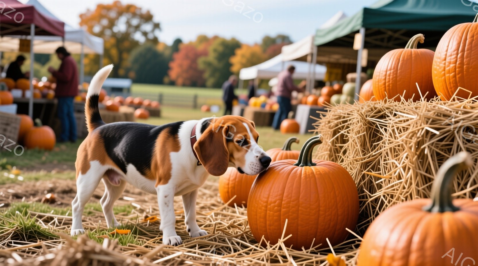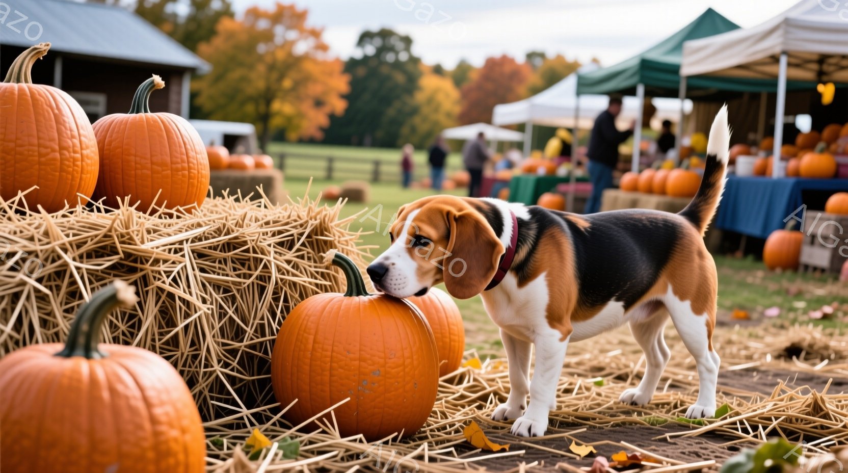 茶色と白の毛並みを持つビーグル犬が、かぼちゃ畑でかぼちゃを興味深そうに覗き込んでいる。背景には、かぼちゃが積み上げられた屋根付きのスペースと、秋の黄葉した木々が見え、秋の収穫の雰囲気が漂う。犬は赤い首輪を着用し、活発で好奇心旺盛な様子が伺える。