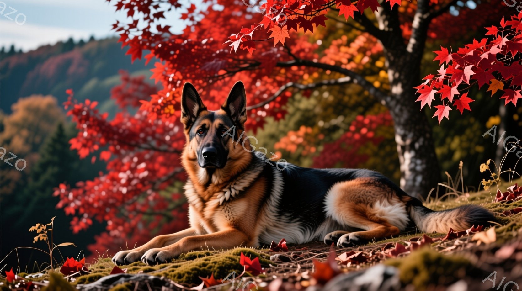 鮮やかな赤葉に囲まれた緑の苔の上に、ジャーマンシェパードが横たわっています。その表情は穏やかで、まっすぐな視線で何かを見つめているようです。背景には、鮮やかな紅葉と、ぼやけた木々の風景が広がり、秋の穏やかな雰囲気を醸し出しています。