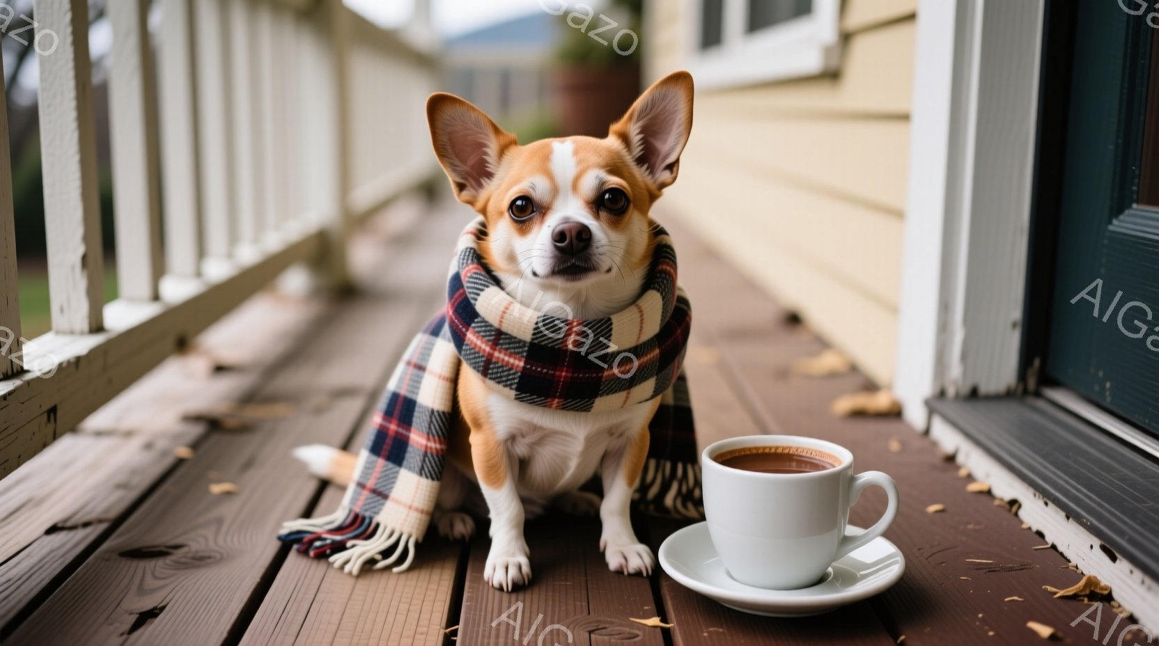 小さなチワワが、チェック柄のショールを首に巻いて、木製のデッキの上に座っています。その表情はどこか自信に満ちており、正面を見つめています。背景には緑豊かな庭と、白壁の建物が見え、穏やかで心地よい雰囲気が漂っています。