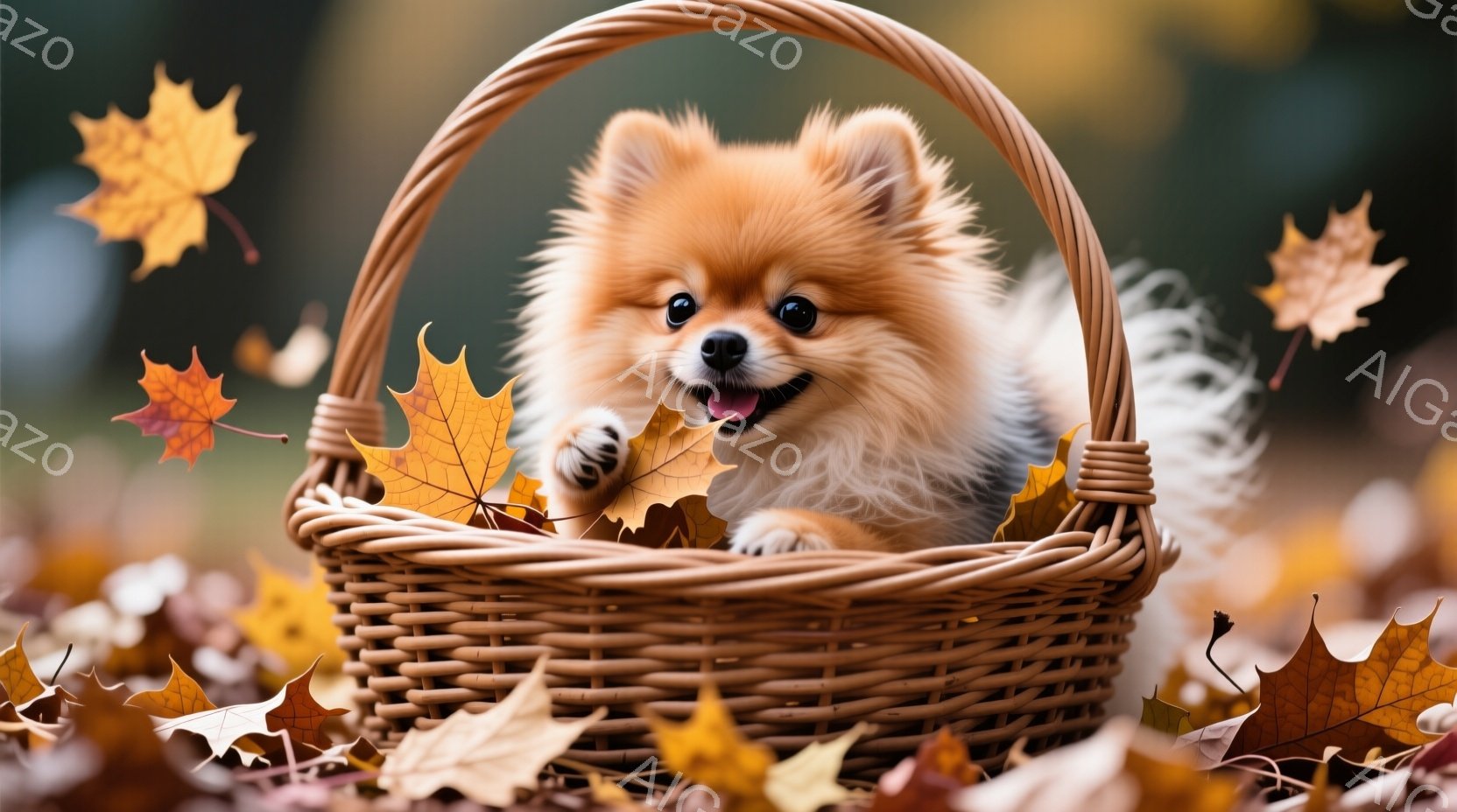 ふわふわの茶色のポメラニアンの子犬が、編まれたバスケットの中に座っており、前足で落ち葉をつかんでいます。背景には、秋の落ち葉が敷き詰められた地面と、ぼやけた緑の自然が見え、暖かく穏やかな秋の雰囲気が漂っています。子犬は嬉しそうに微笑んでおり、全体的に愛らしくて温かい印象を与えます。