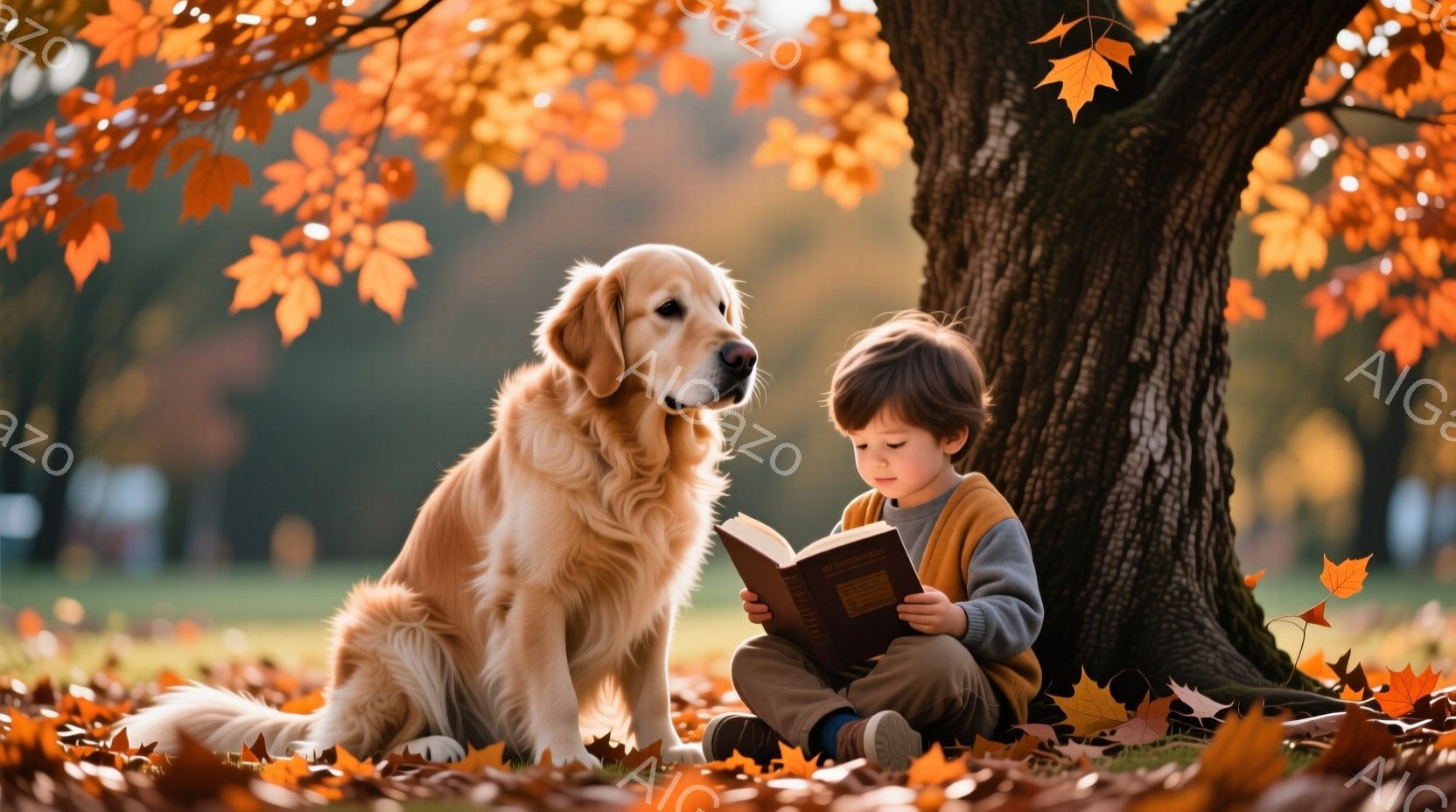 少年は地面に座り、本を熱心に読んでいます。金色の毛並みの大型犬が少年の隣で座り、穏やかな表情で彼を見守っています。背景には秋の紅葉が広がり、暖かく穏やかな雰囲気を醸し出しています。