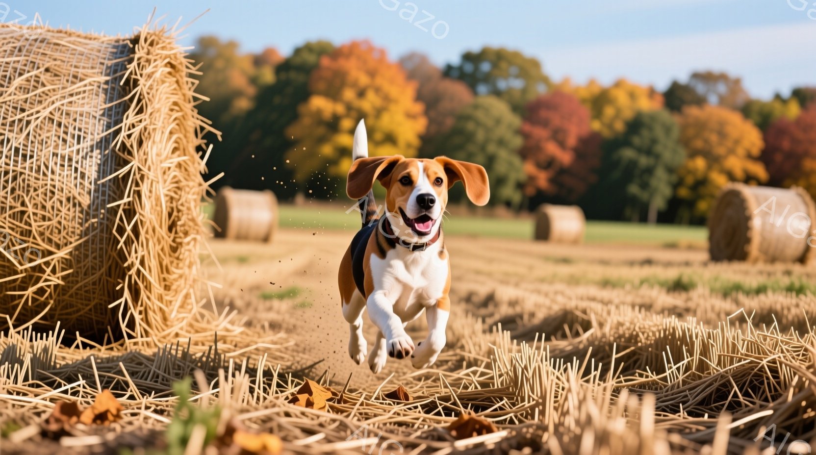 広大な麦わら畑を、茶色と白の毛並みのビーグル犬が勢いよく駆け抜けている。犬は口を開けて嬉しそうに走り、その周りには土埃が舞い上がっている。背景には、緑豊かな木々と秋らしい色づきが見られ、晴天の下、暖かく活気のある雰囲気が漂っている。