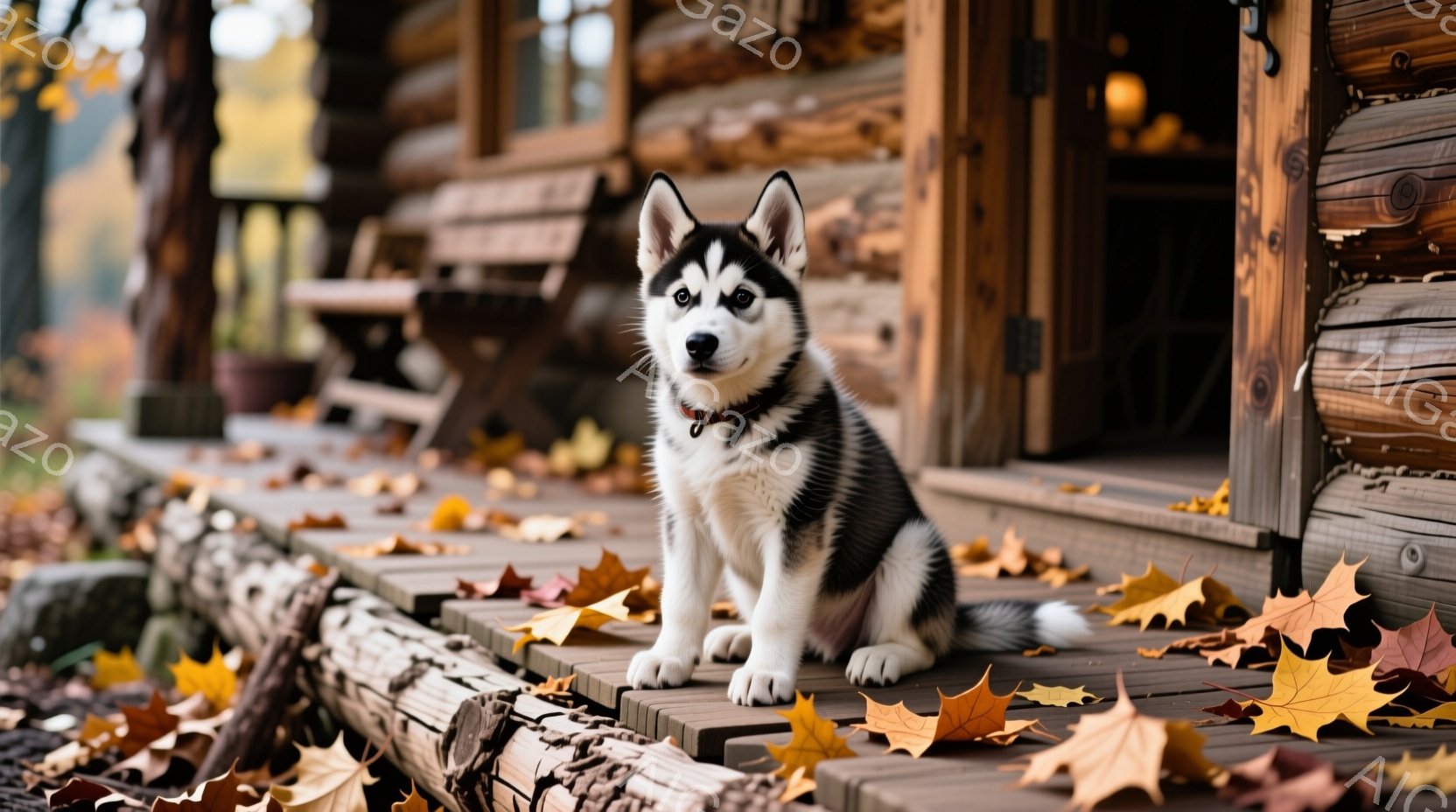 シベリアンハスキーの子犬が、落ち葉が散らばる木のデッキの上に座っています。子犬は真っ白と黒の毛並みで、前方にまっすぐ見つめ、真剣な表情をしています。背景には、木製の小屋があり、周囲は秋の紅葉に染まった自然に囲まれています。
