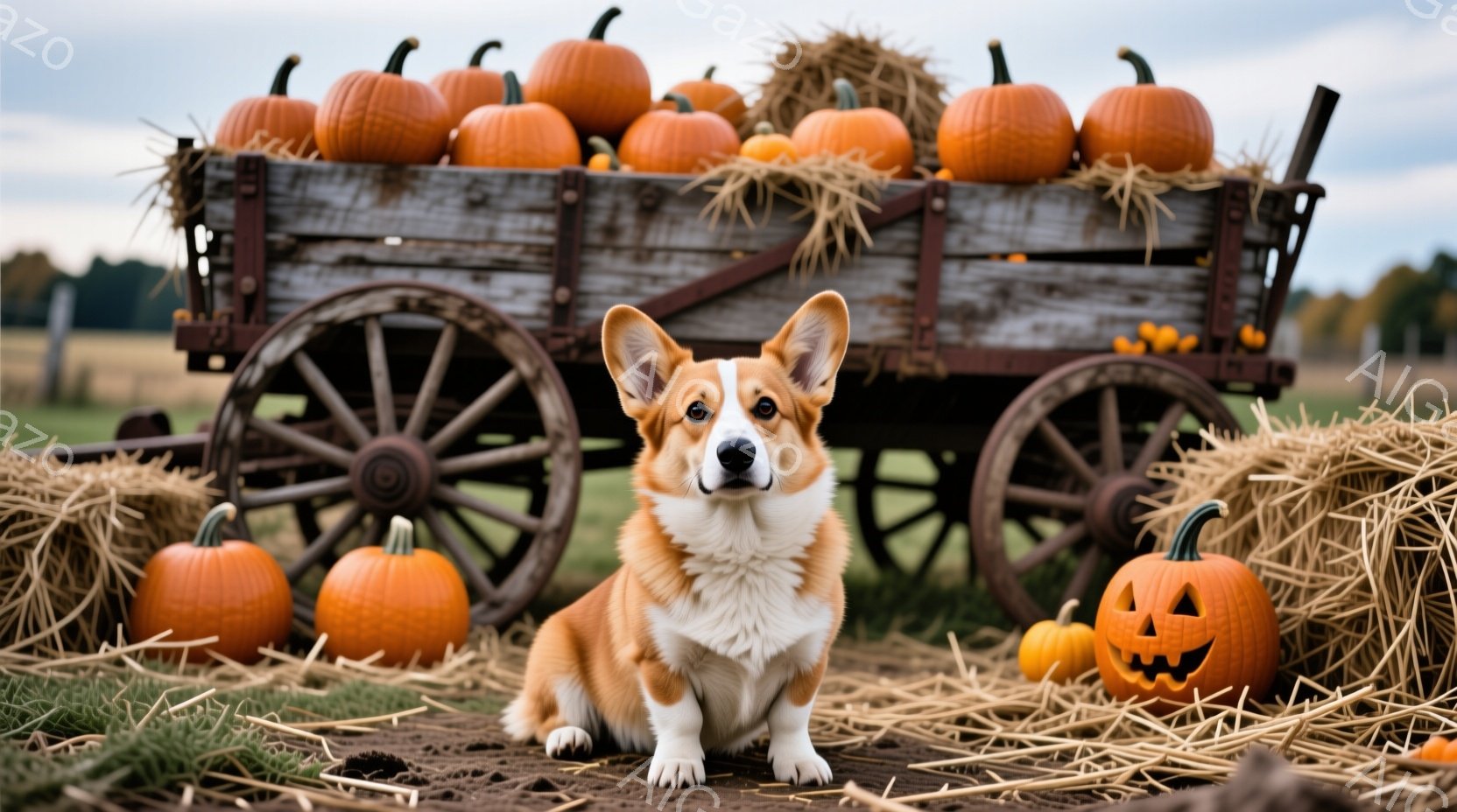 コルギ犬が、かぼちゃが積まれた古い馬車を背景に、藁の上に座っています。犬は正面を向き、穏やかな表情でカメラを見つめており、秋の収穫祭を思わせる温かい雰囲気です。背景には緑の牧草地が広がり、晴れた空が広がっています。