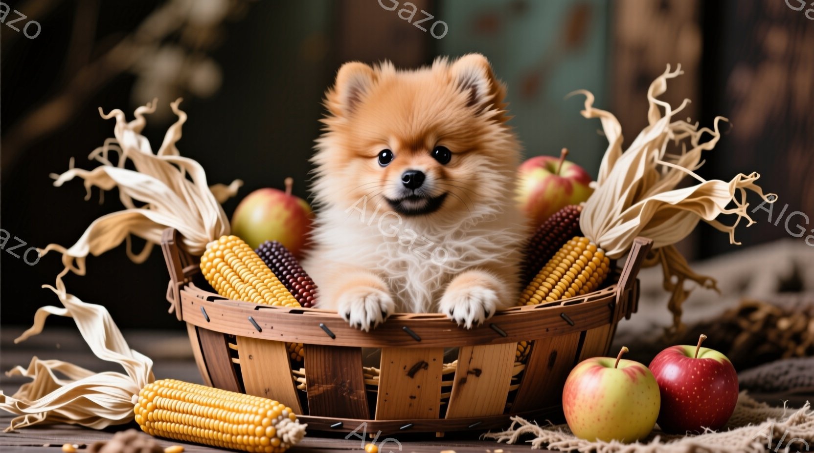 籠の中にふわふわの茶色のポメラニアンの子犬が座っており、好奇心旺盛な表情で正面を見ています。籠の周りには、乾燥したトウモロコシや赤いリンゴが置かれ、秋の収穫を思わせる雰囲気です。背景は暗く、全体的に暖かく、素朴な雰囲気の静物画です。
