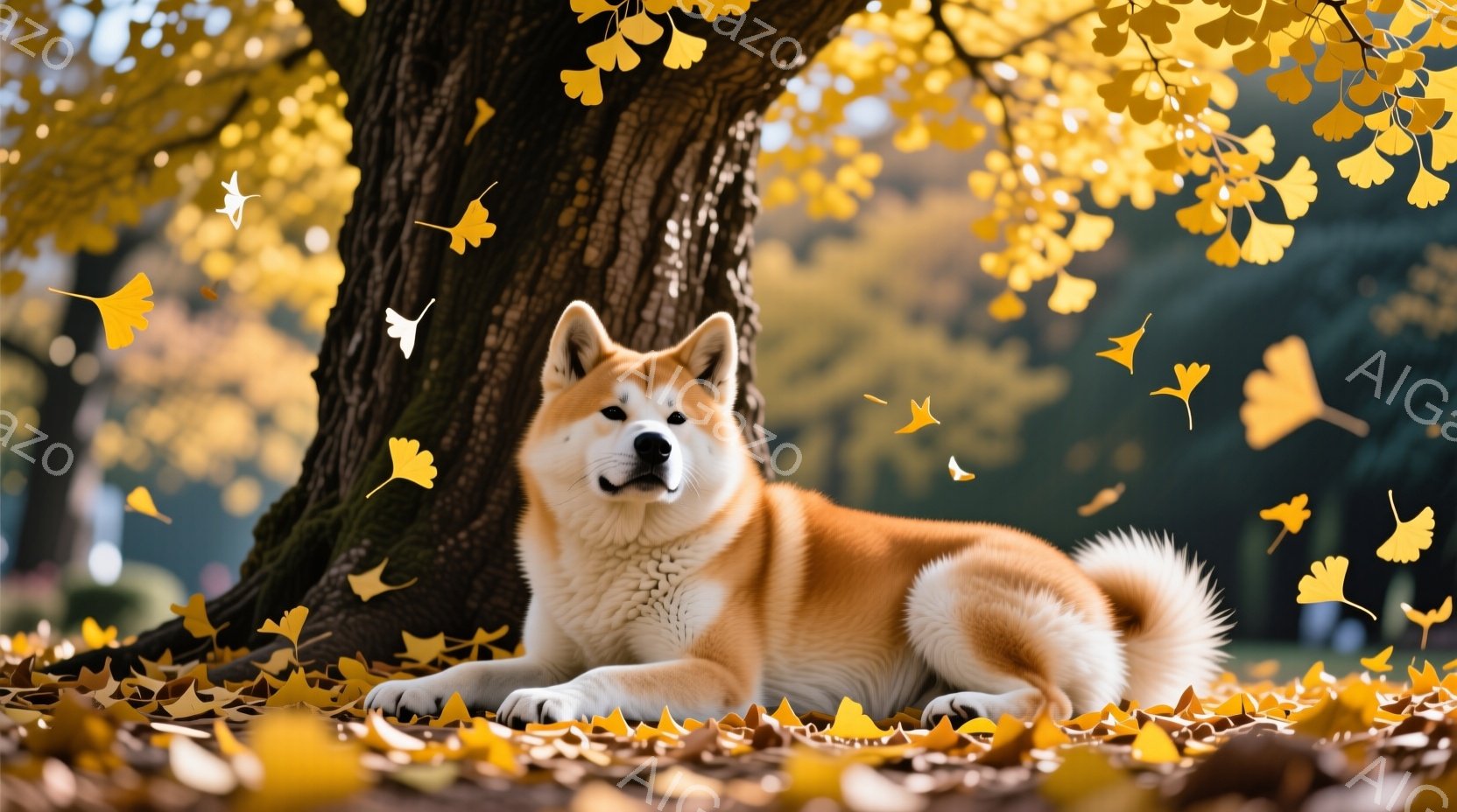 秋のイチョウの木の下に、柴犬が横たわっています。黄金色のイチョウの葉が舞い降り、地面や犬の周りを覆っています。犬はリラックスした表情で、穏やかで温かい秋の雰囲気が漂っています。