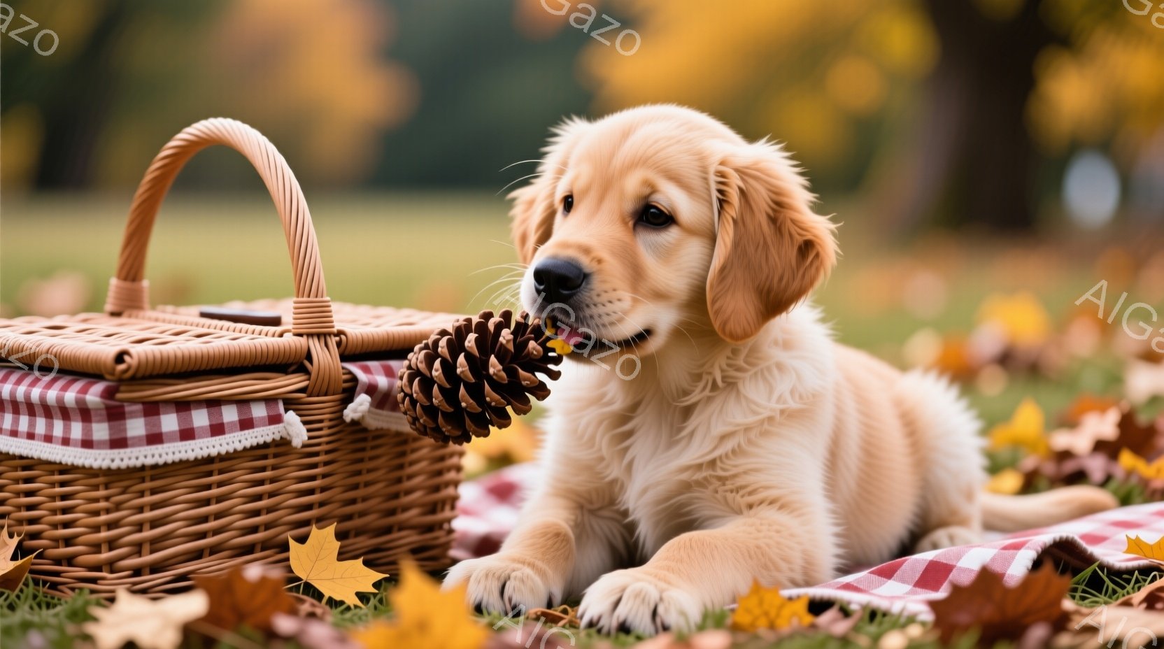 明るい黄金色のゴールデンレトリバーの子犬が、赤いチェックの敷物の上に横たわっています。子犬は口に松ぼっくりをくわえ、穏やかで幸せそうな表情をしています。背景には落ち葉が散らばり、籐編みのバスケットと緑の植物が置かれ、秋の暖かく心地よい雰囲気が漂っています。
