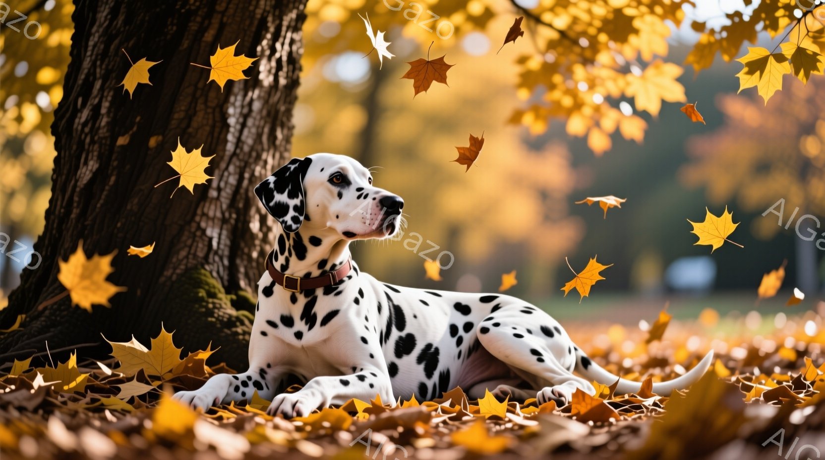 白地に黒い斑点模様のダルメシアンが、秋の森の中で木の根元に横たわっています。背景には鮮やかな紅葉が舞い散り、地面も落ち葉で覆われ、暖かく穏やかな秋の雰囲気が漂っています。ダルメシアンは首輪をつけ、リラックスした様子で遠くを見つめています。