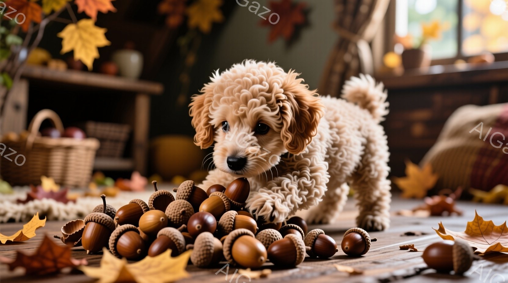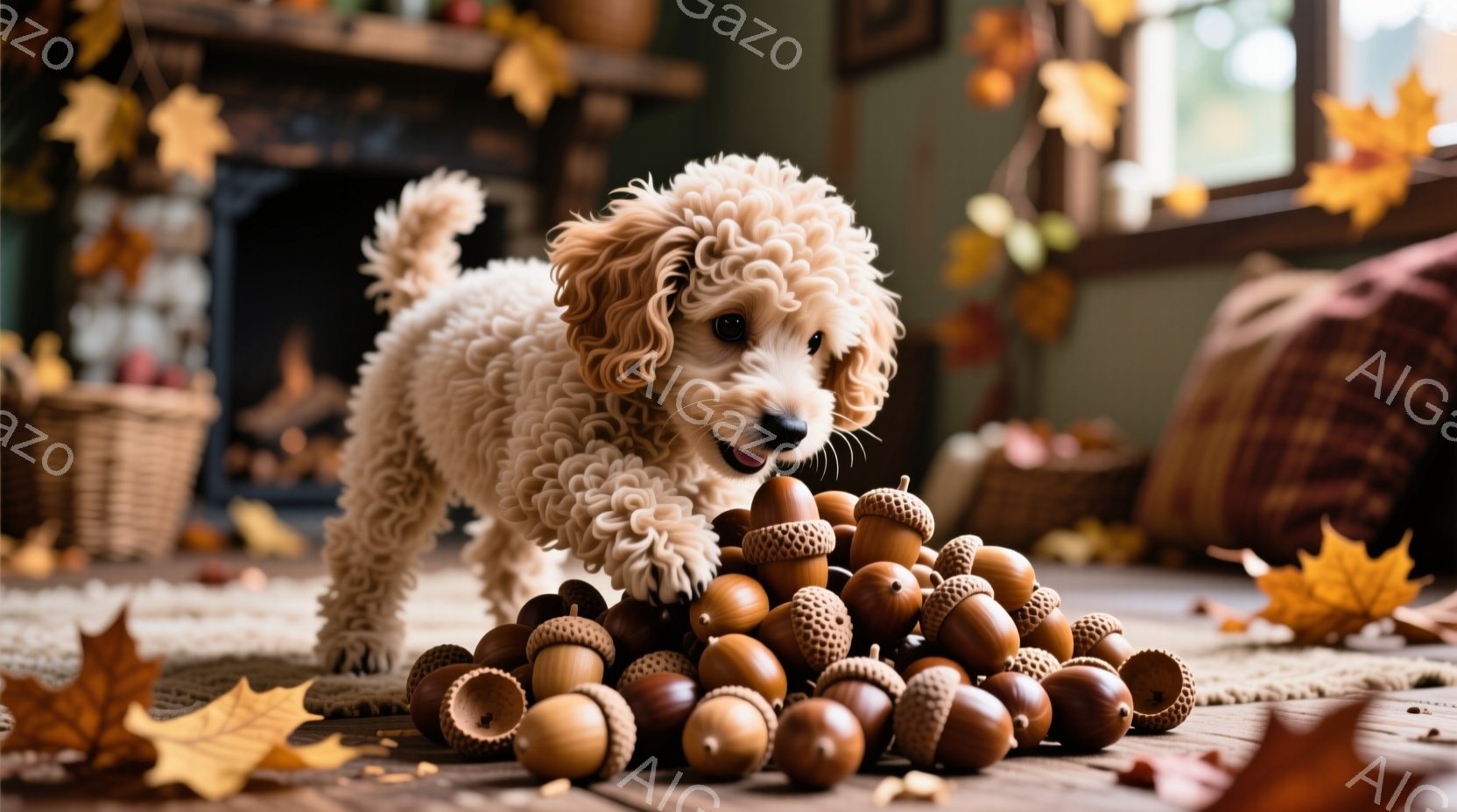 ふわふわのクリーム色の巻き毛の犬が、たくさんのドングリに囲まれて遊んでいます。犬は前足でドングリを軽く押すように触れ、好奇心旺盛な表情をしています。背景には、籐のバスケットや暖炉が見え、秋の暖かく心地よい雰囲気を醸し出しています。