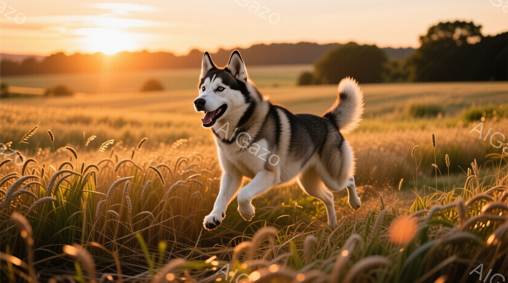 シベリアンハスキーが黄金色の麦畑を駆け抜けている。太陽が沈みかけ、暖かく柔らかな光が犬の毛並みを照らし、活気に満ちた表情が捉えられている。背景には緑の丘と空が広がり、穏やかで牧歌的な雰囲気を醸し出している。