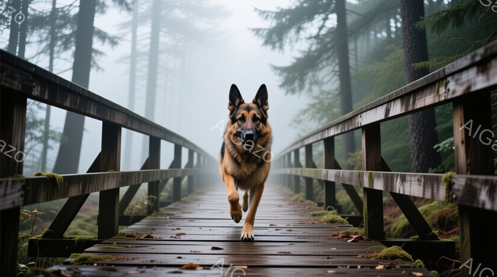 鮮やかな毛並みのジャーマンシェパードが、木製の橋の上を勢いよく走っている。背景は霧に包まれた森林で、木々のシルエットがぼんやりと見え、湿った空気を感じさせる。全体的に、活気がありながらも静寂な雰囲気で、自然の中での力強い躍動感が伝わってくる。