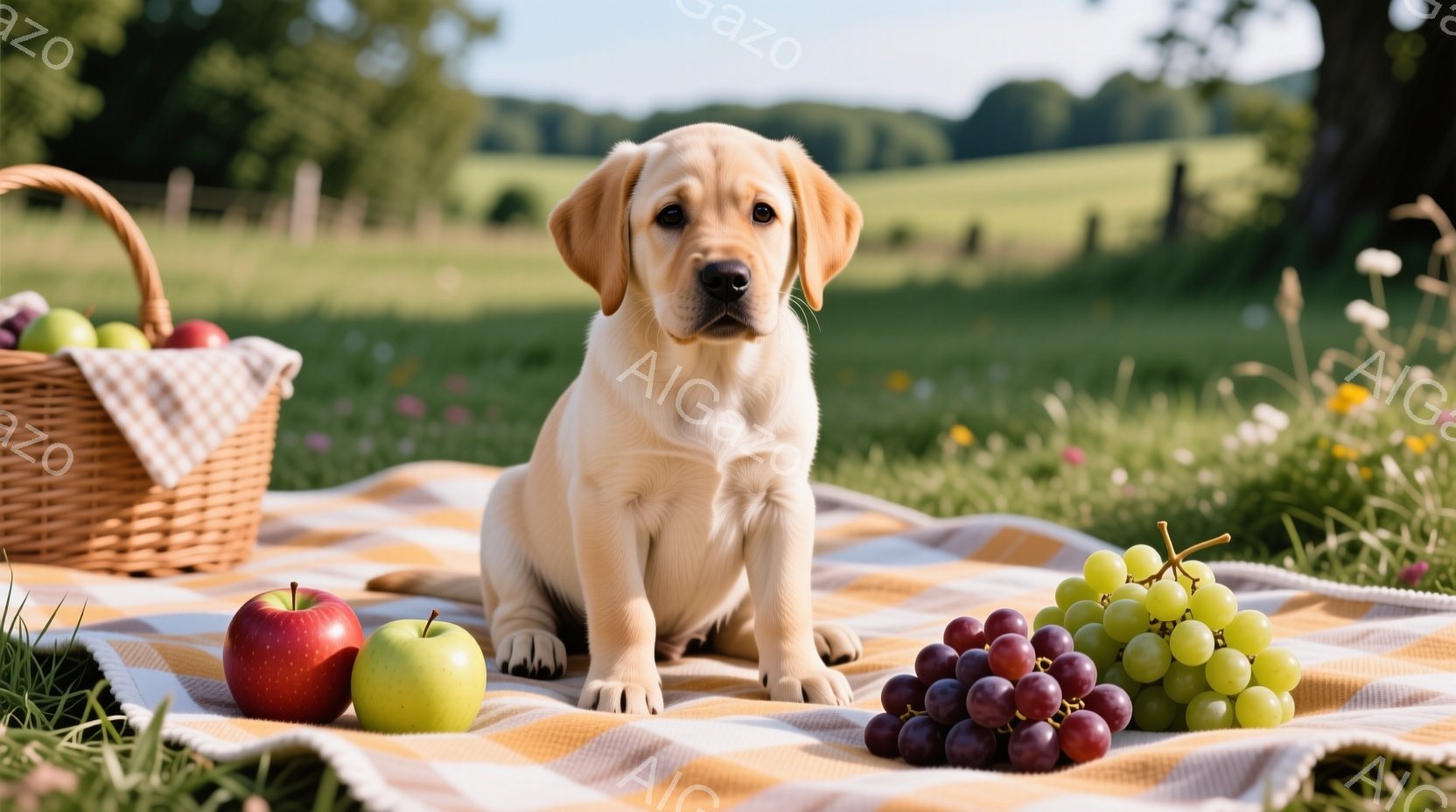 柔らかいチェック柄の敷物の上に、クリーム色の可愛い子犬が座っています。周りにはリンゴやブドウが置かれ、籐のバスケットも並んでいます。緑豊かな草原が広がり、暖かい日差しが降り注ぐ、のどかなピクニックの風景です。