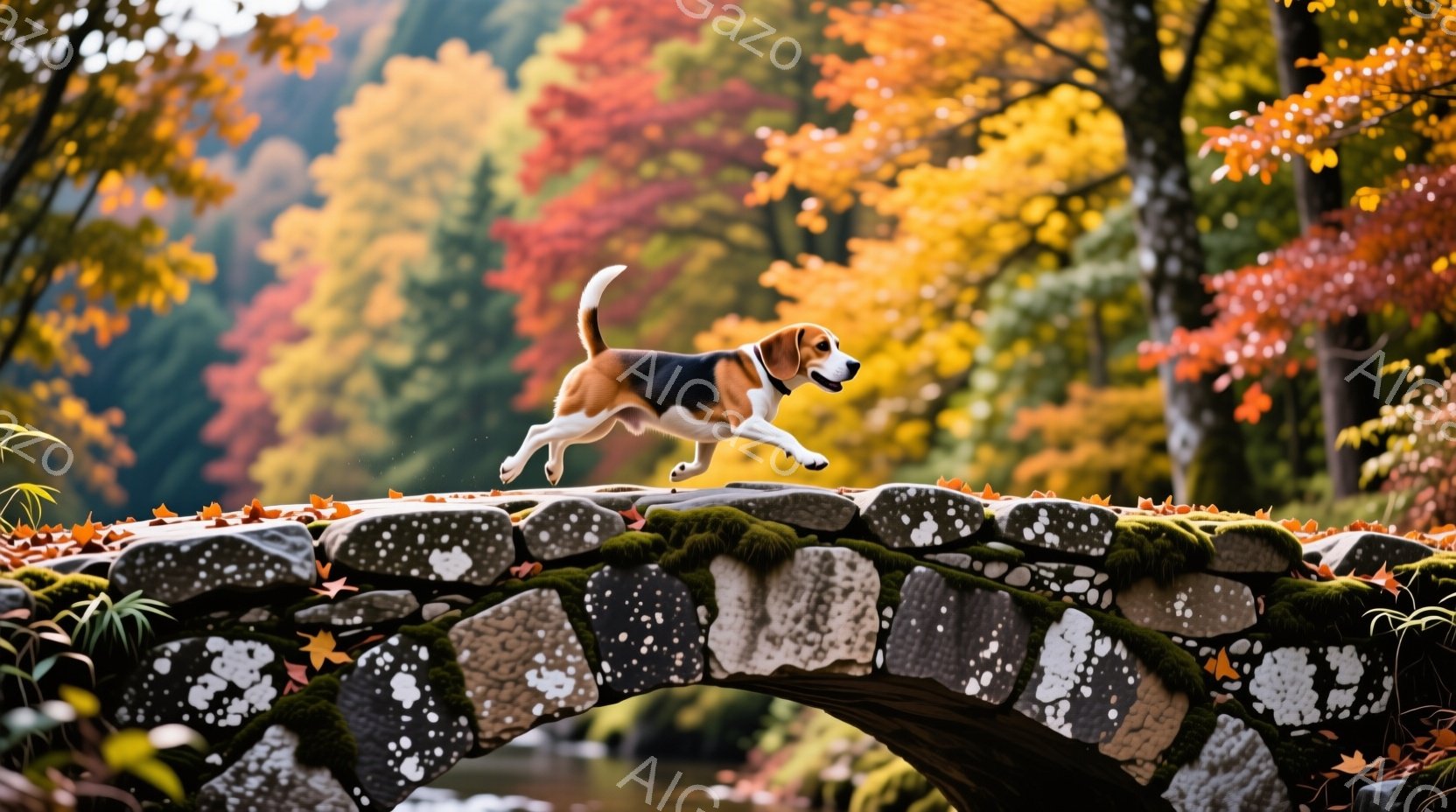 一匹のビーグル犬が苔むした石造りのアーチ橋の上を駆け抜けている。背景には鮮やかな紅葉の木々と、穏やかな水面が広がり、秋の暖かく穏やかな雰囲気を醸し出している。犬は活発で楽しそうに走り、その姿は自然の美しさの中で生き生きとしている。