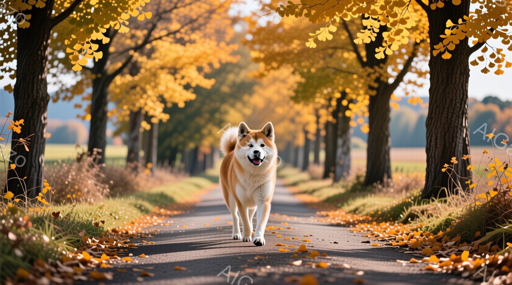 鮮やかな黄色の葉が並ぶ道の中央を、柴犬が前方を向いて歩いている。犬は口を開けて微笑んでいるように見え、活気に満ちた表情をしている。背景には高い木々と緑の草地が広がり、穏やかで秋らしい雰囲気を醸し出している。