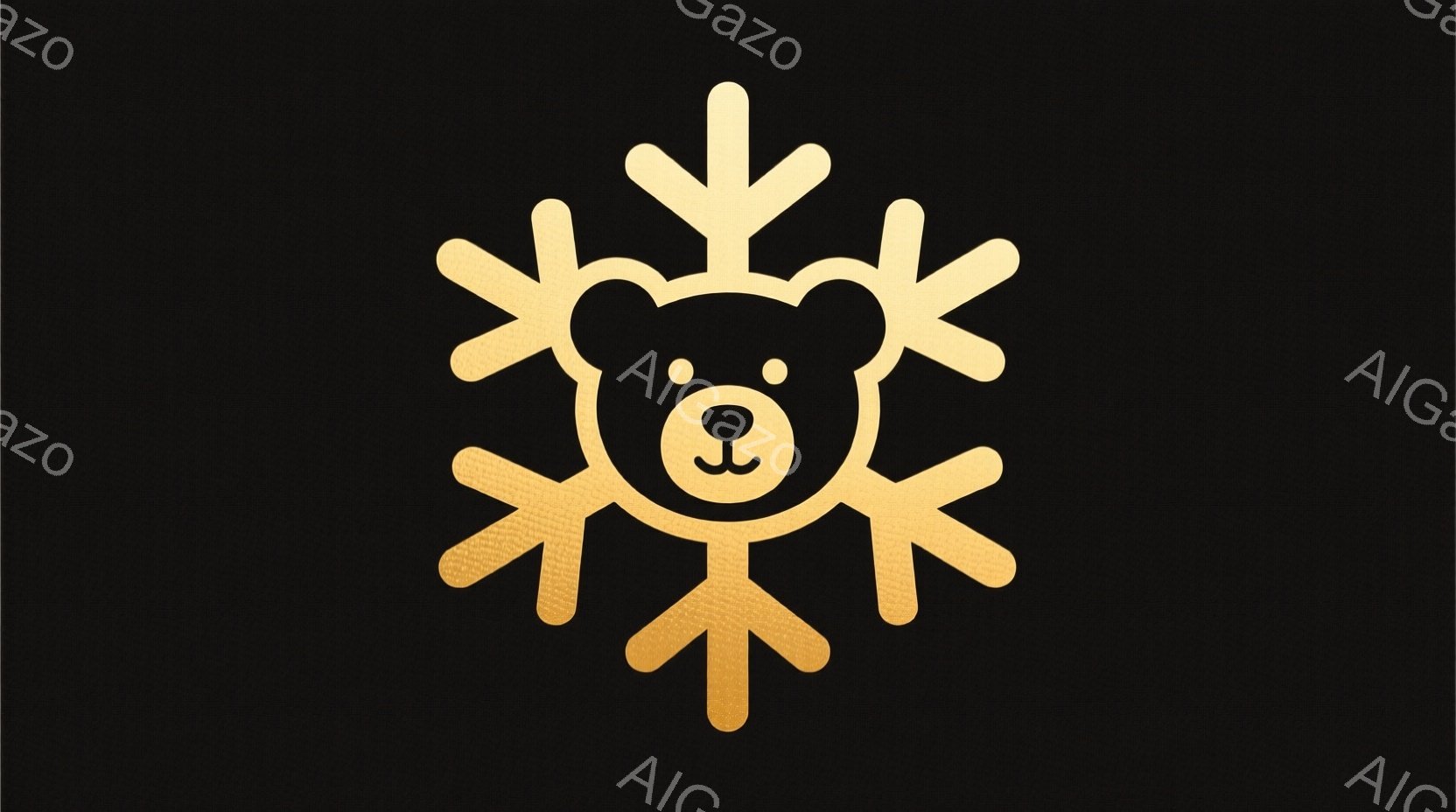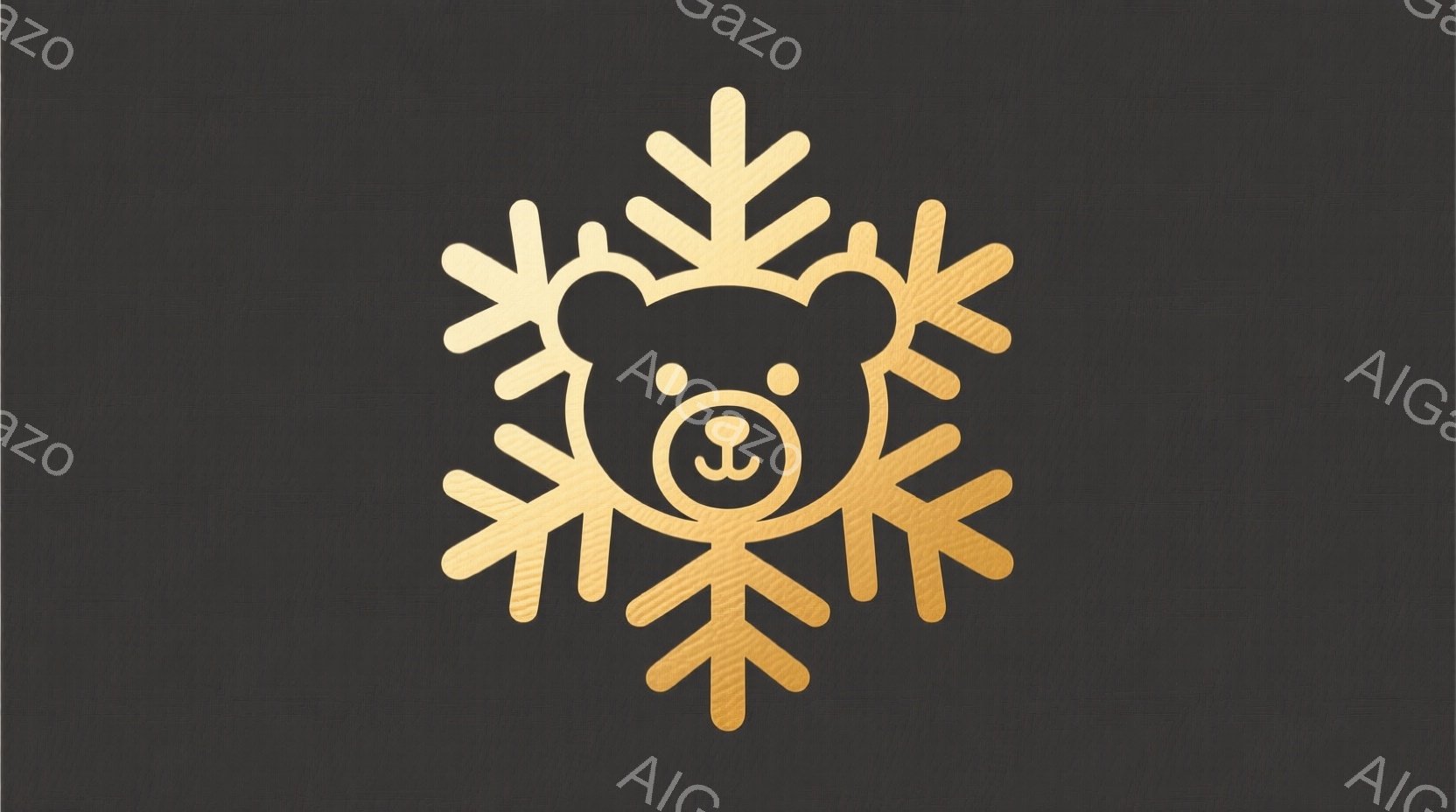 黄金色の雪の結晶の形をしたイラストです。中央には、丸い顔に小さな黒い目と口を持つ、可愛らしいクマの顔が描かれています。背景は濃い茶色で、立体感のある雪の結晶とクマの顔が際立っています。