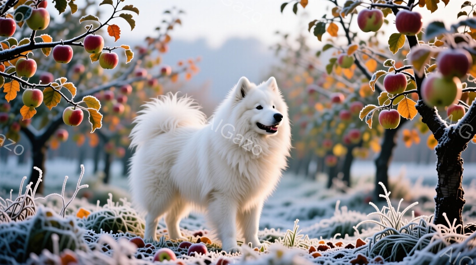 白い毛並みの大きな犬が、霜が降りたリンゴ園の中に立っている。犬は自信に満ちた表情で正面を見据え、毛並みが美しく、堂々とした姿勢を見せている。背景には、リンゴの実をつけた木々が並び、霜で覆われた地面と、薄明るい空気が、冬の静寂で冷たい雰囲気を醸し出している。