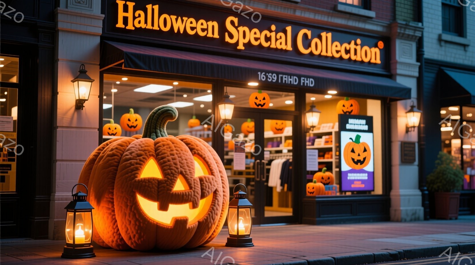 ハロウィーンの装飾が施された店舗の外観で、大きなジャック・オー・ランタンが通りに置かれ、周囲をランタンが照らしています。店舗のショーウィンドウには、ハロウィーンをテーマにした商品が並び、紫、オレンジ、緑の色が目に付く、華やかな雰囲気です。背景には木々や建物が見え、夜の街並みがハロウィーンの特別な雰囲気を醸し出しています。